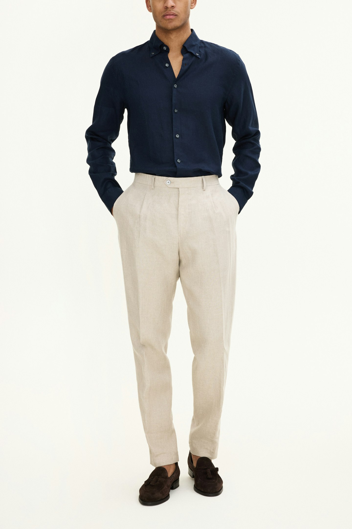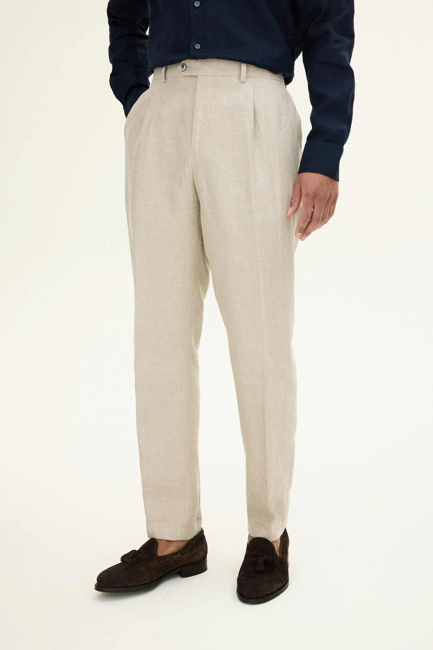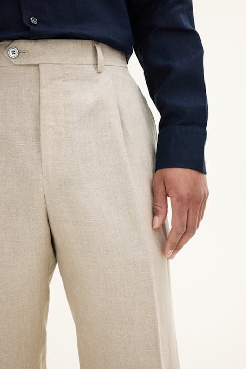 Bukse med en høyt liv og enkle legg, med videre passform i lår og avsmalnede ben. Laget i tynt linstoff.
