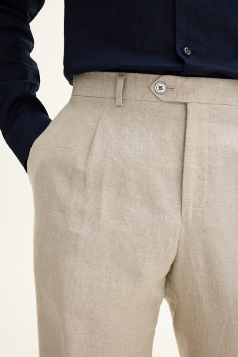 Bukse med en høyt liv og enkle legg, med videre passform i lår og avsmalnede ben. Laget i tynt linstoff.