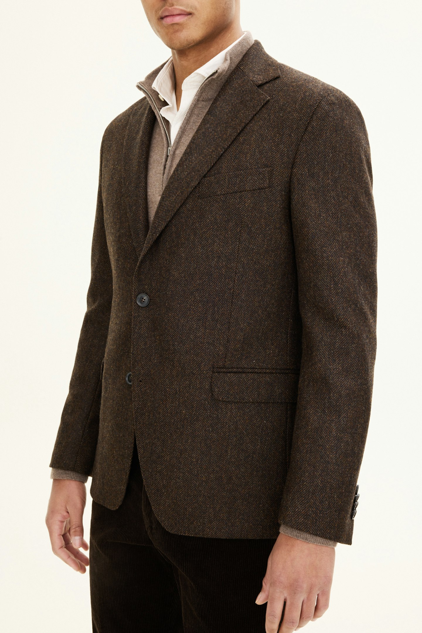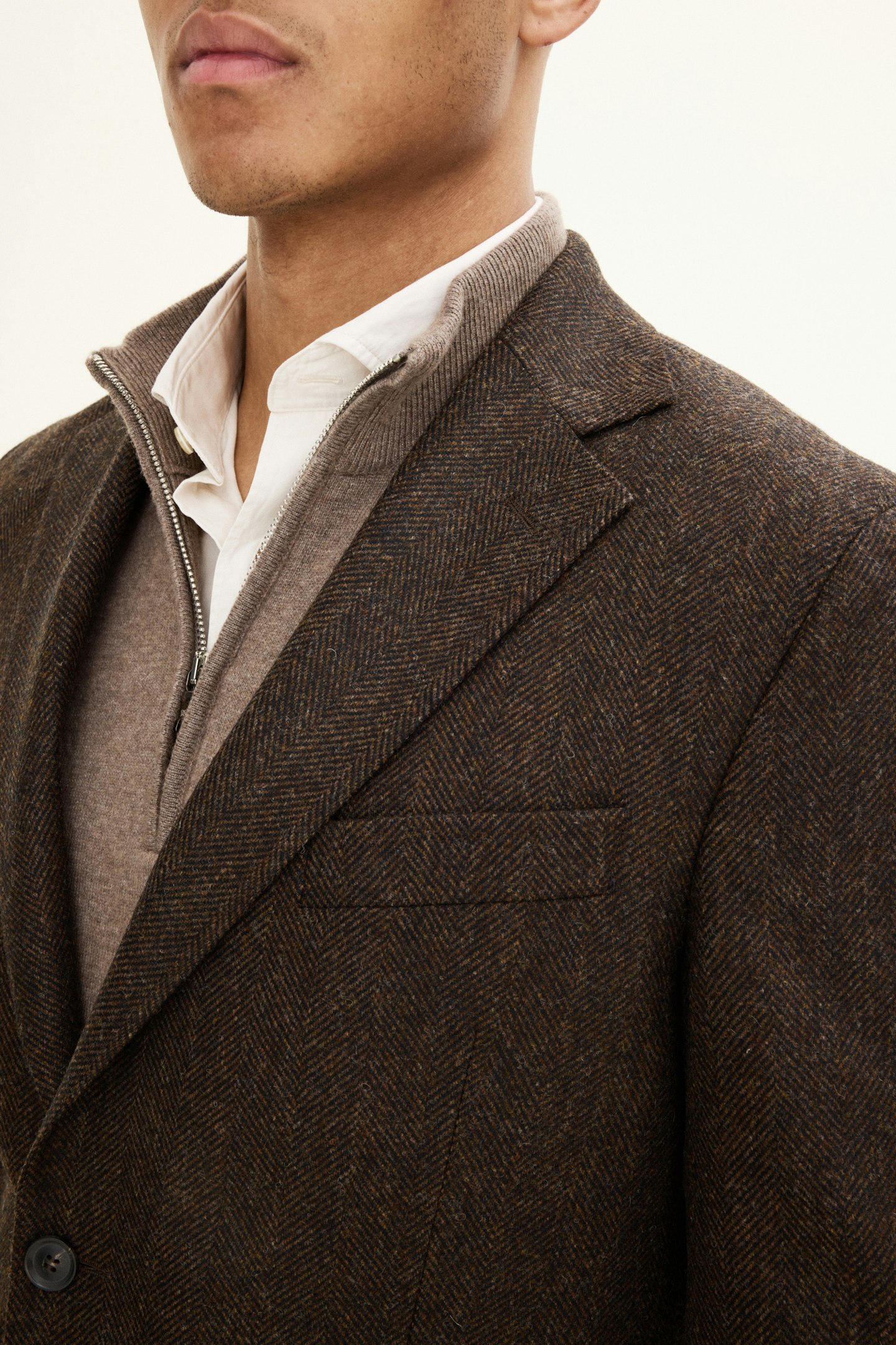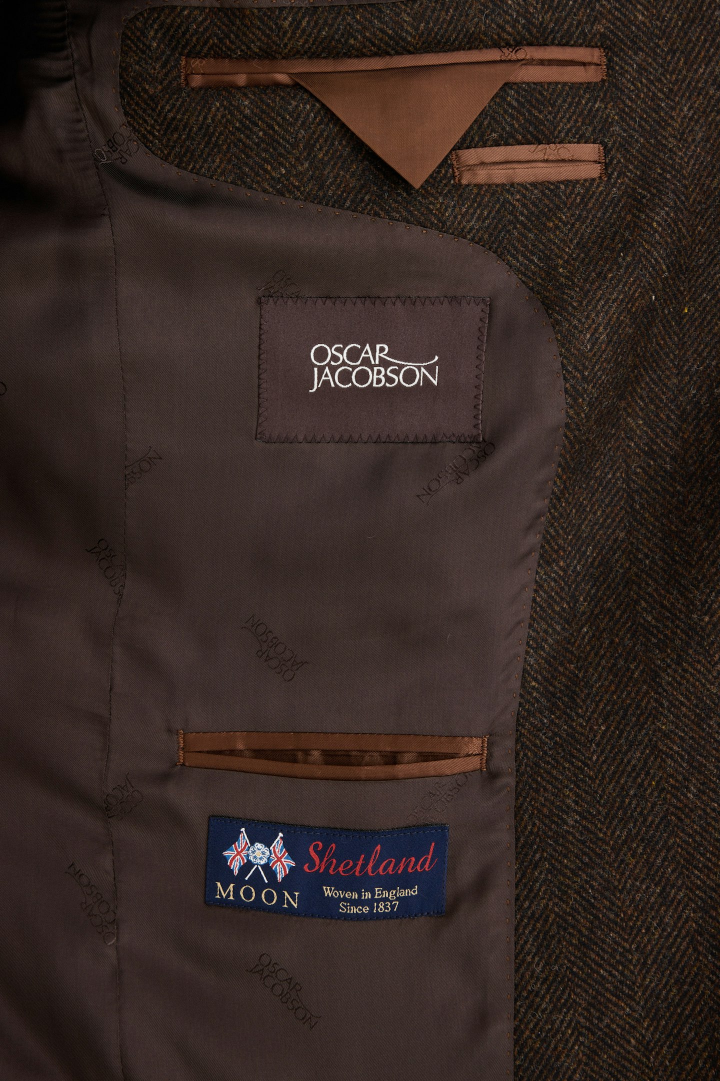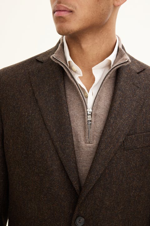 Dette produktet er laget av et fiskebensvevd børstet ullstoff fra Abraham Moon & Sons.