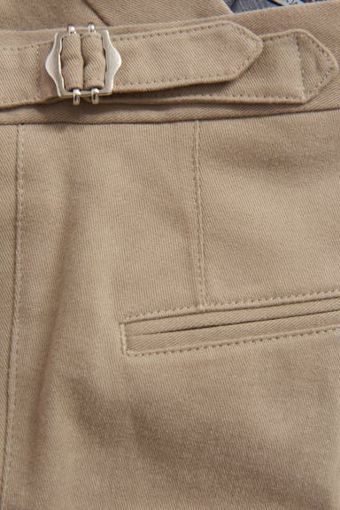 Bukse med høyt liv, legg foran og smalere i ankelen. Her i et tyngre bomullsstoff med en myk følelse som ligner på mollskinn.