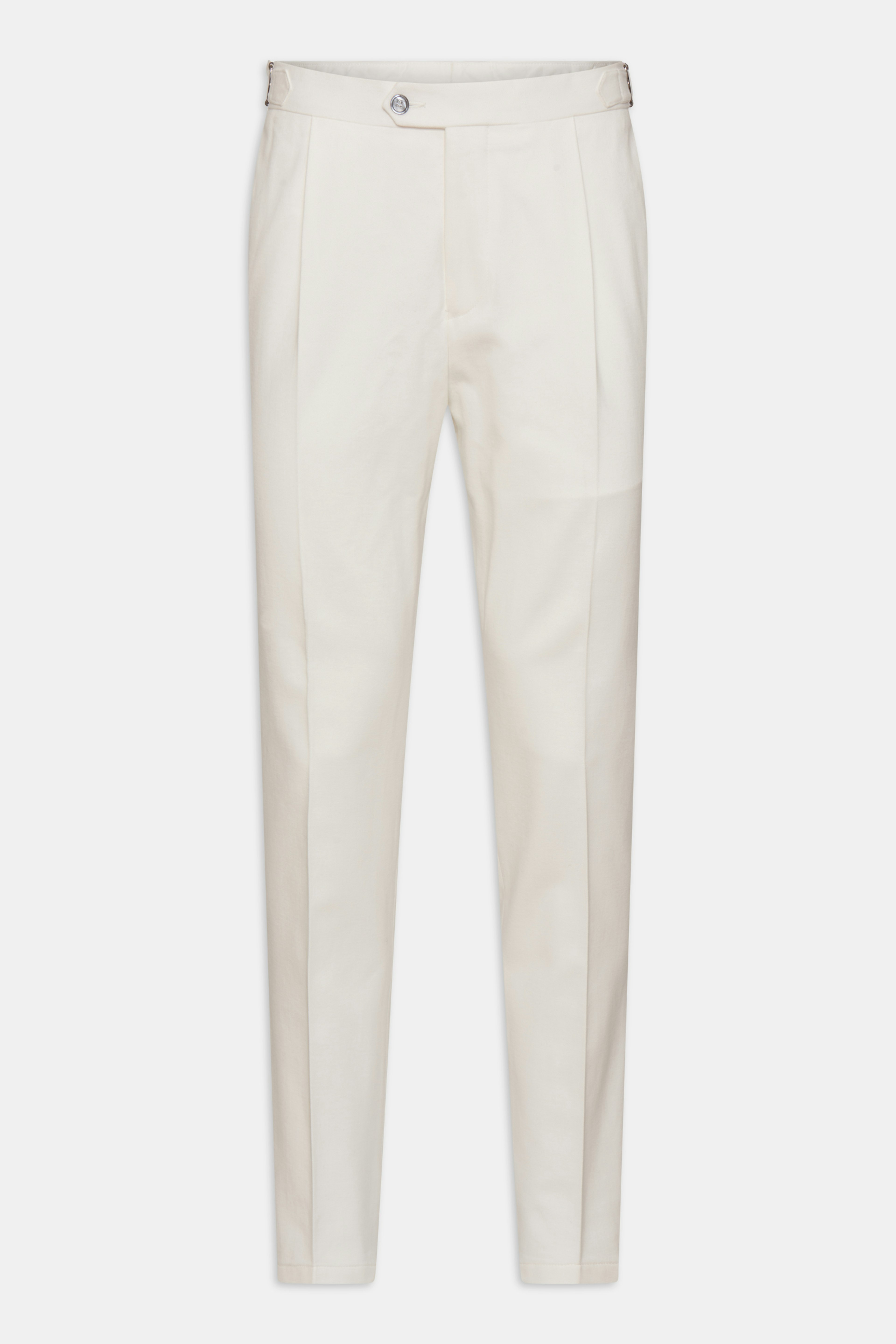 Bukse med høyt liv, legg foran og smalere i ankelen. Her i et tyngre bomullsstoff med en myk følelse som ligner på mollskinn.
