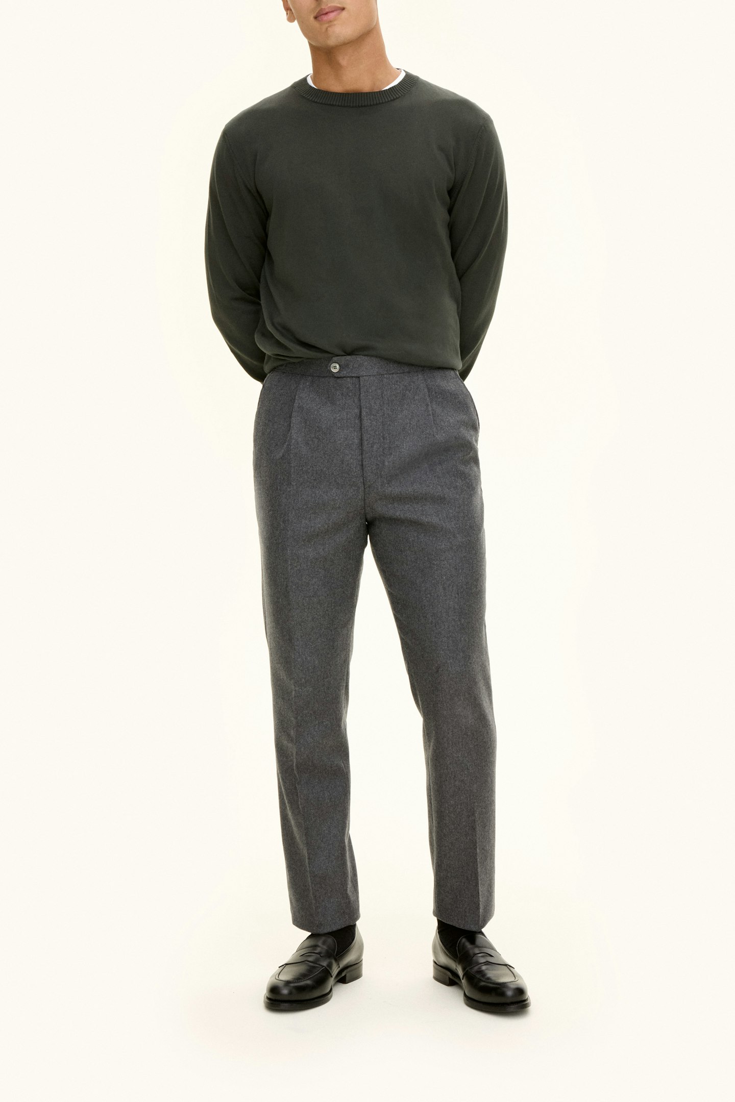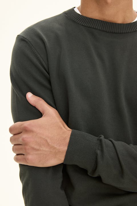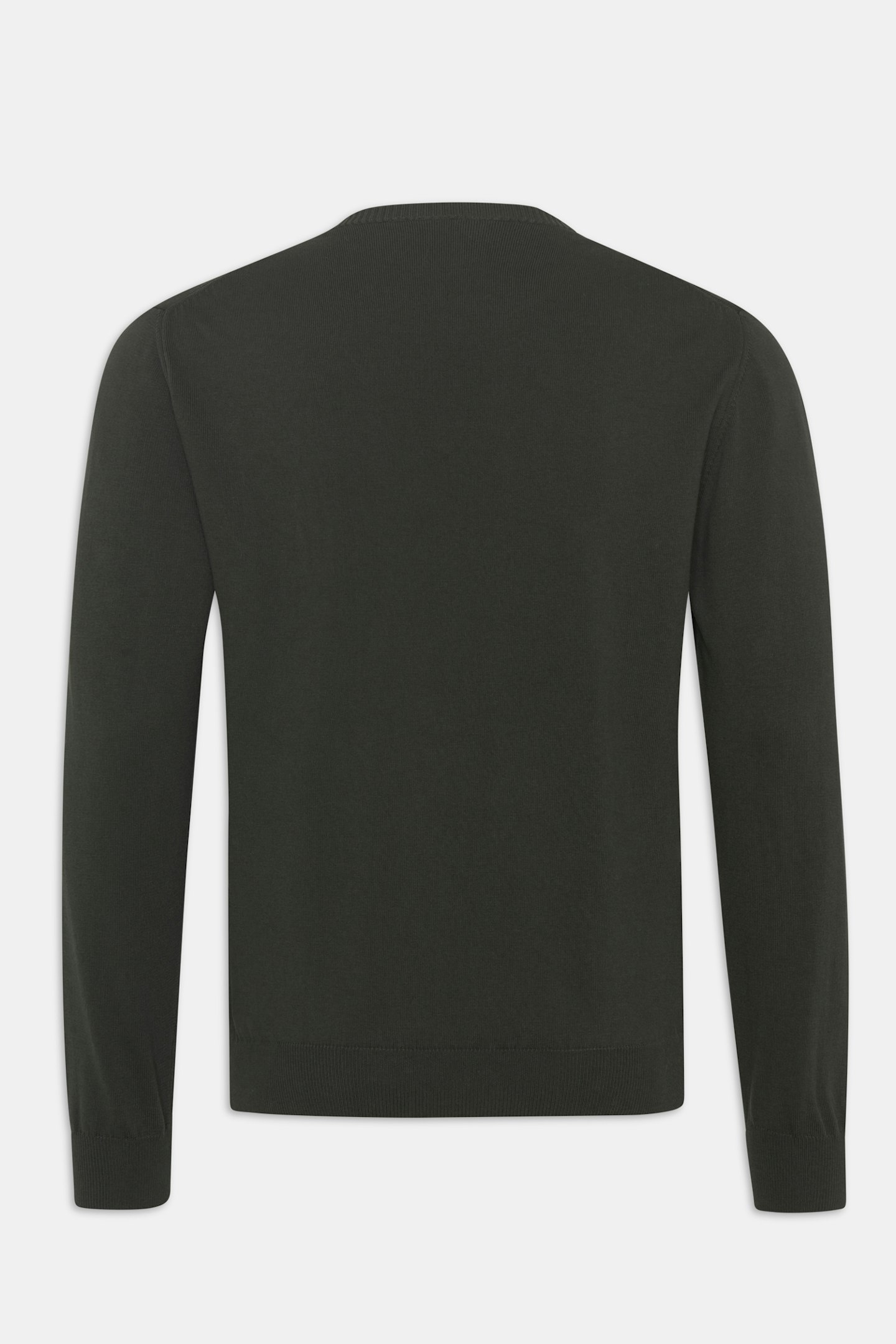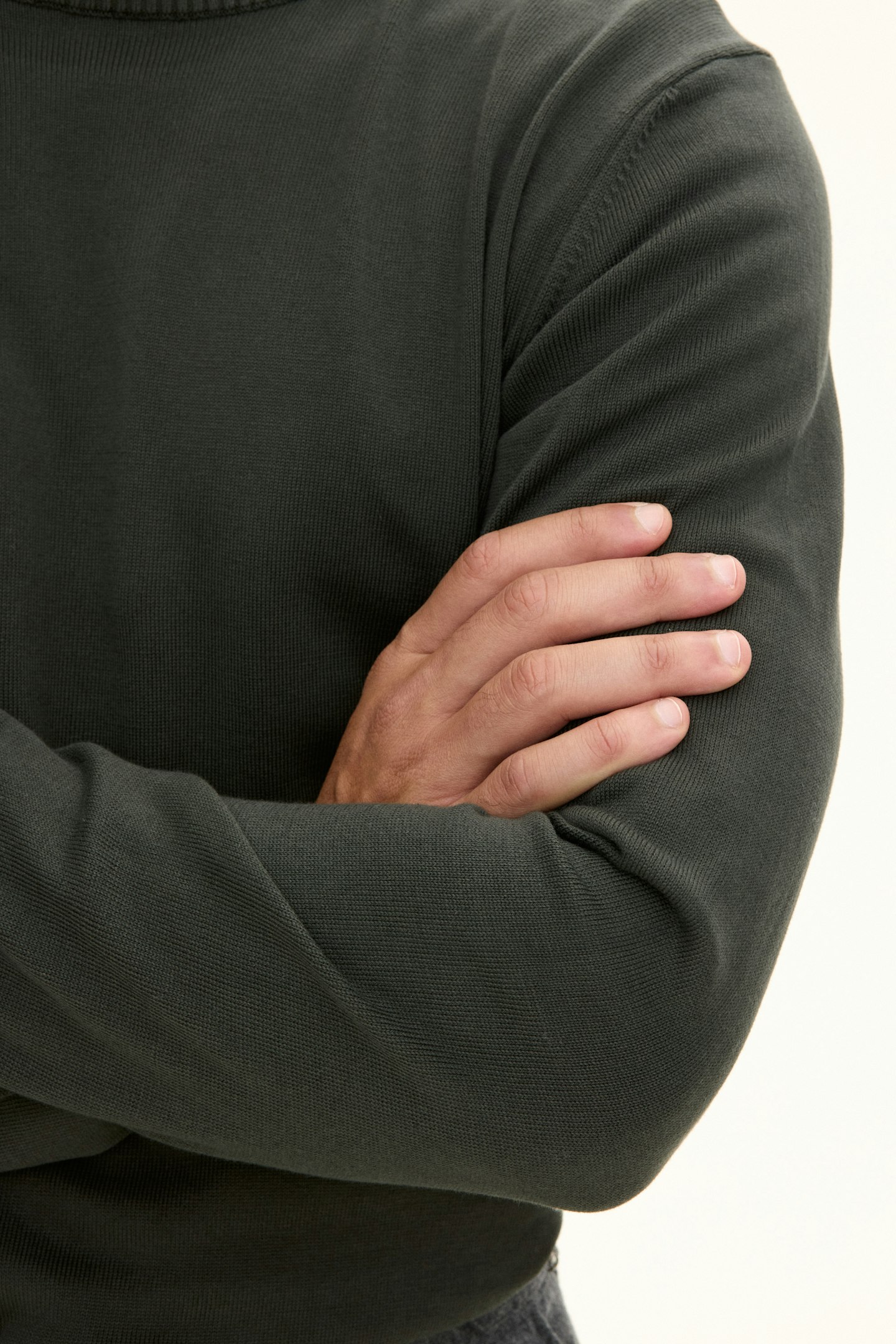 Rundhalset strikket genser utstyrt med ribbestrikket krage. Laget av et tynt bomullsstoff som passer perfekt om sommeren.