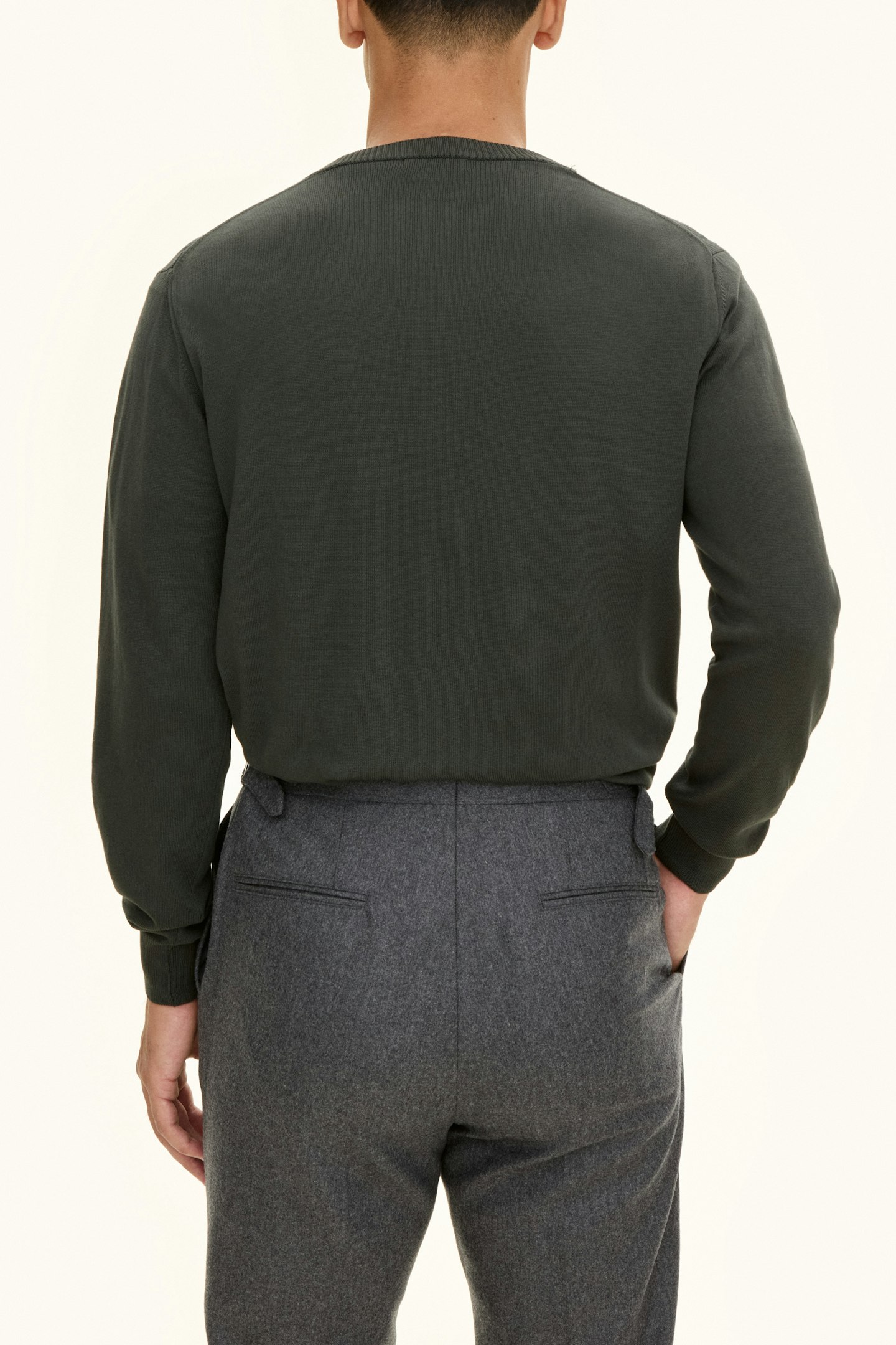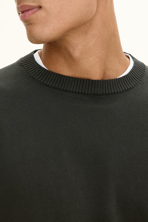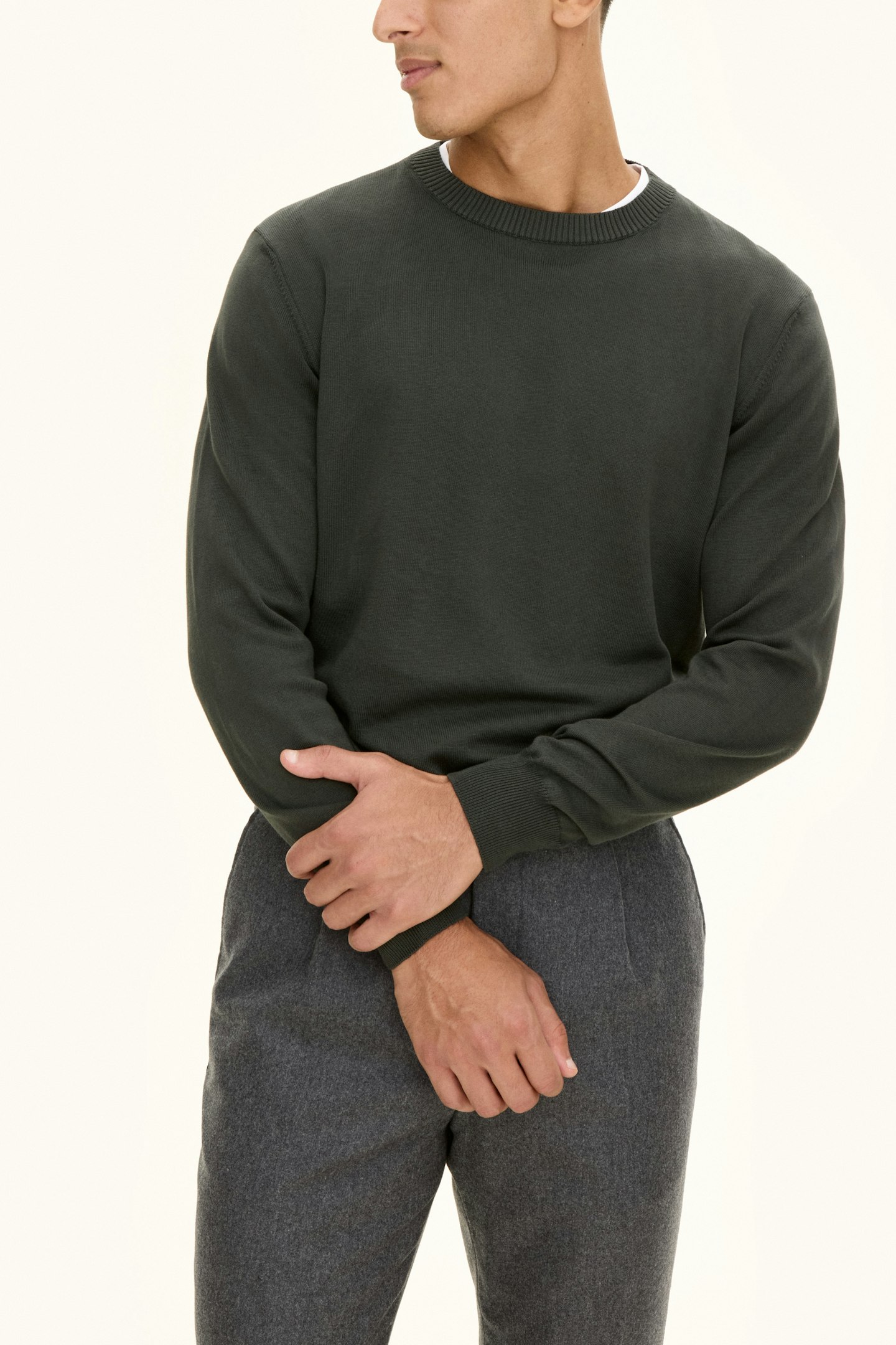 Rundhalset strikket genser utstyrt med ribbestrikket krage. Laget av et tynt bomullsstoff som passer perfekt om sommeren.