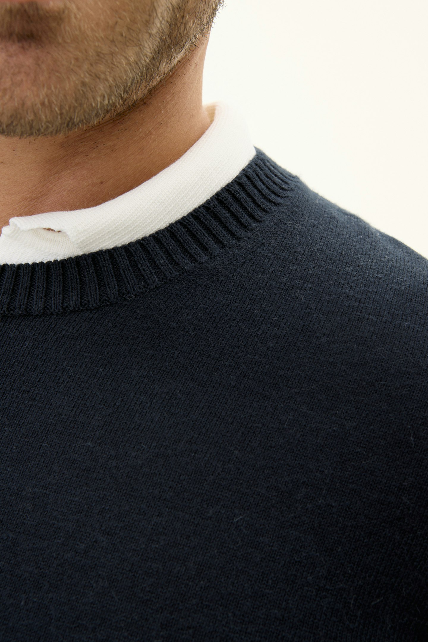 Denne genseren av bomull og kasjmir er et fantastisk mykt plagg med en enkel krage som er 2x2 ribbestrikket. Kragen er strikket med dobbelt garn for en jevn og stilfull finish. Genseren er strikket med 12gg, og fungerer både over en t-skjorte eller skjorte og under en blazer.