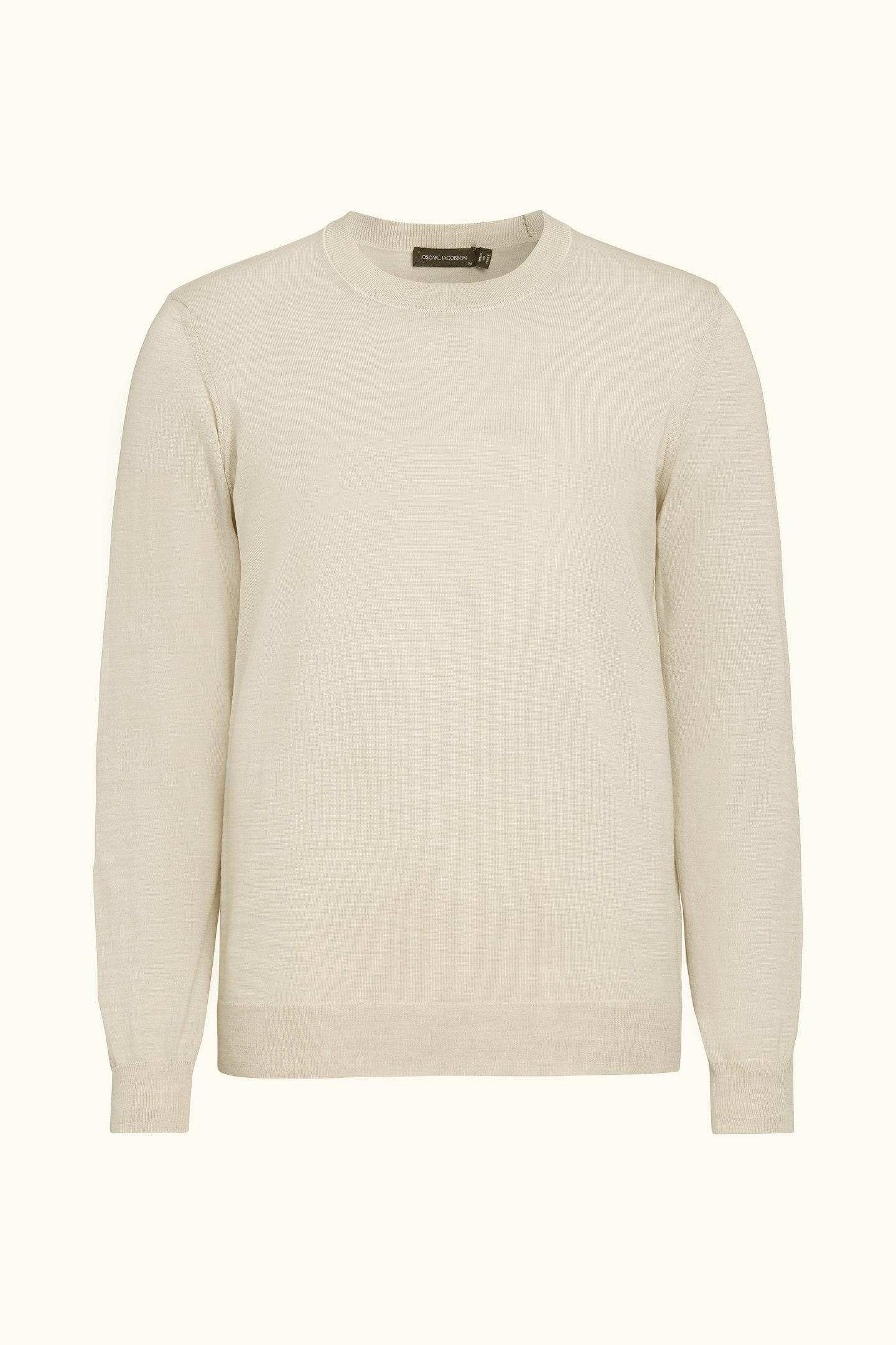 Rundhalset genser i ekstra fin merinoull fra Tollegno, Italia. Ullfibrene er lange, noe som gir plagget en luksuriøs og noe blank overflate. Enkel halsribb i dobbelt garn som gir godt hold. Tynnstrikket, 14gg som er god å ha under blazer.
