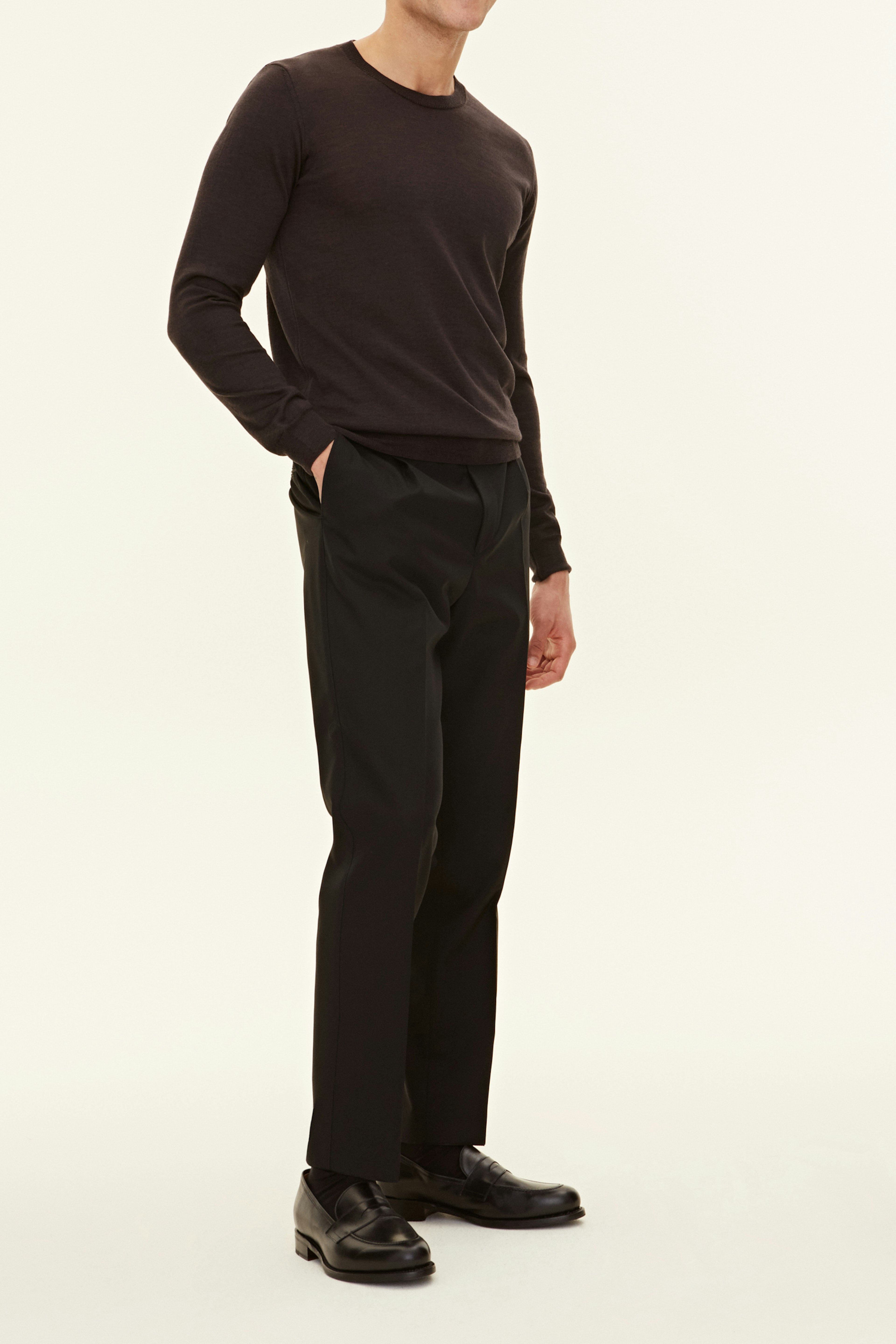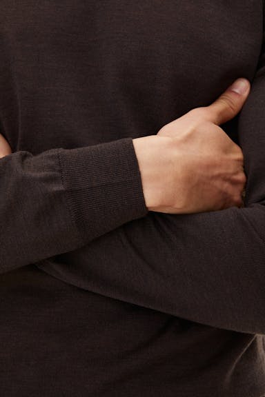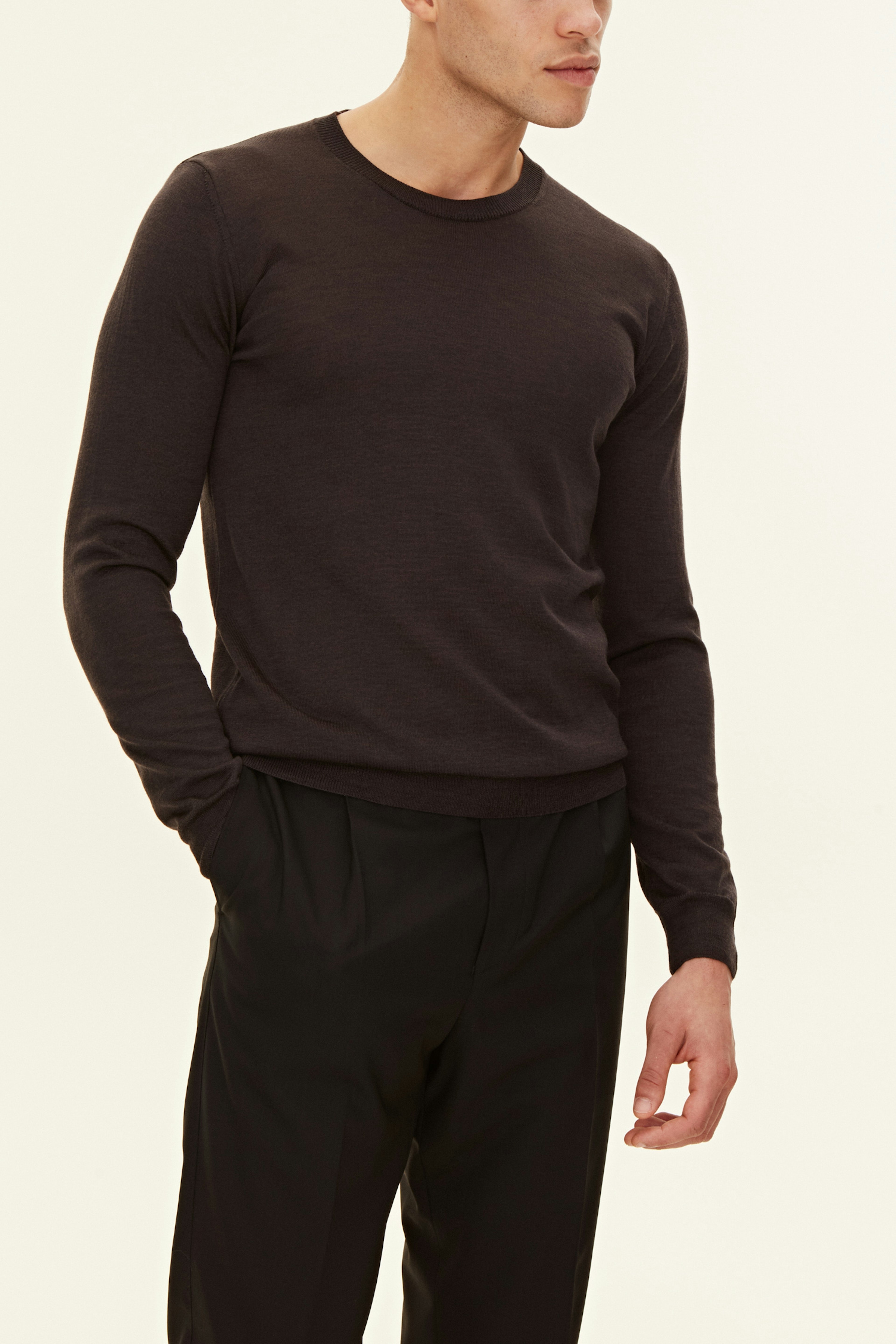 Rundhalset genser i ekstra fin merinoull fra Tollegno, Italia. Ullfibrene er lange, noe som gir plagget en luksuriøs og noe blank overflate. Enkel halsribb i dobbelt garn som gir godt hold. Tynnstrikket, 14gg som er god å ha under blazer.