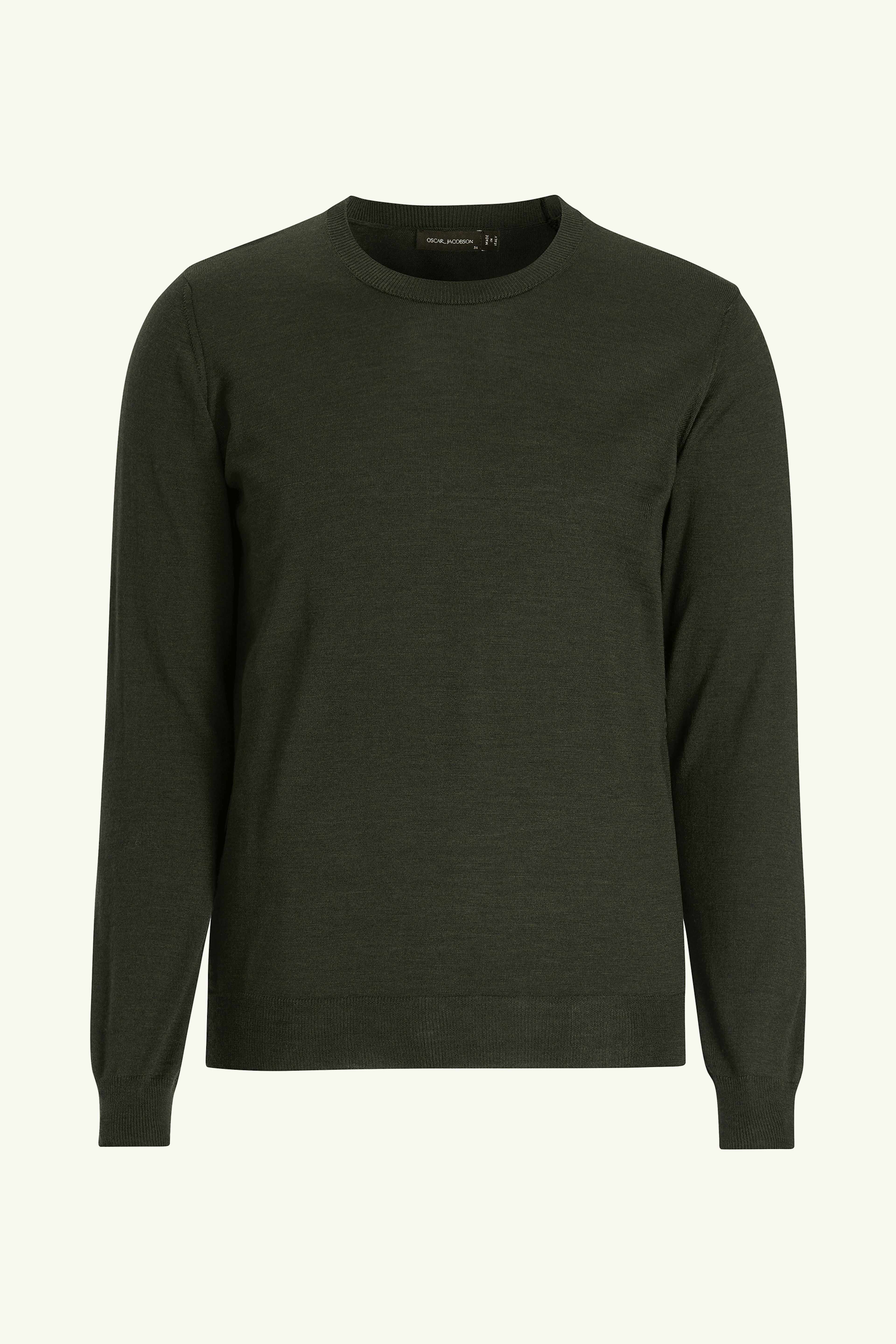Rundhalset genser i ekstra fin merinoull fra Tollegno, Italia. Ullfibrene er lange, noe som gir plagget en luksuriøs og noe blank overflate. Enkel halsribb i dobbelt garn som gir godt hold. Tynnstrikket, 14gg som er god å ha under blazer.