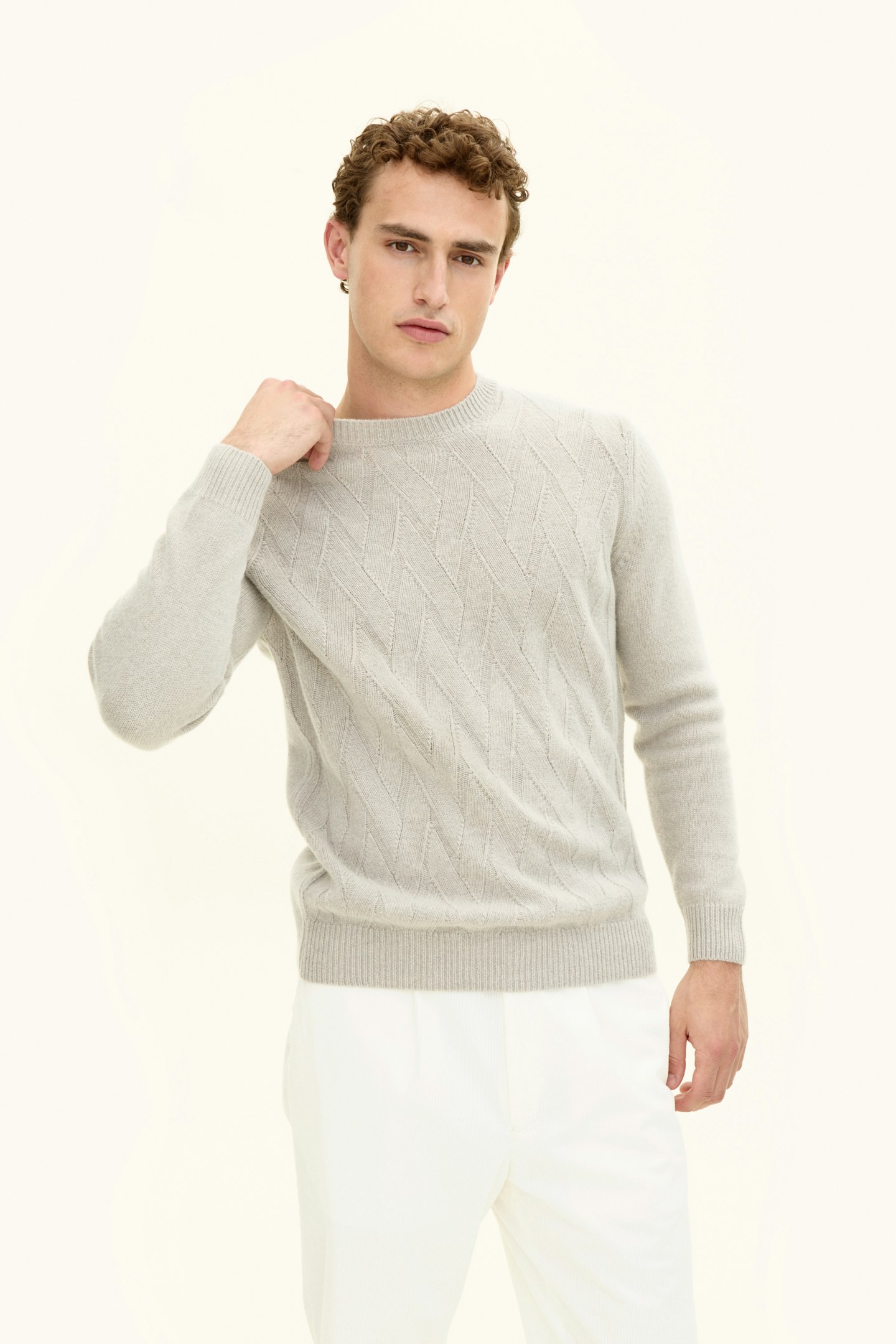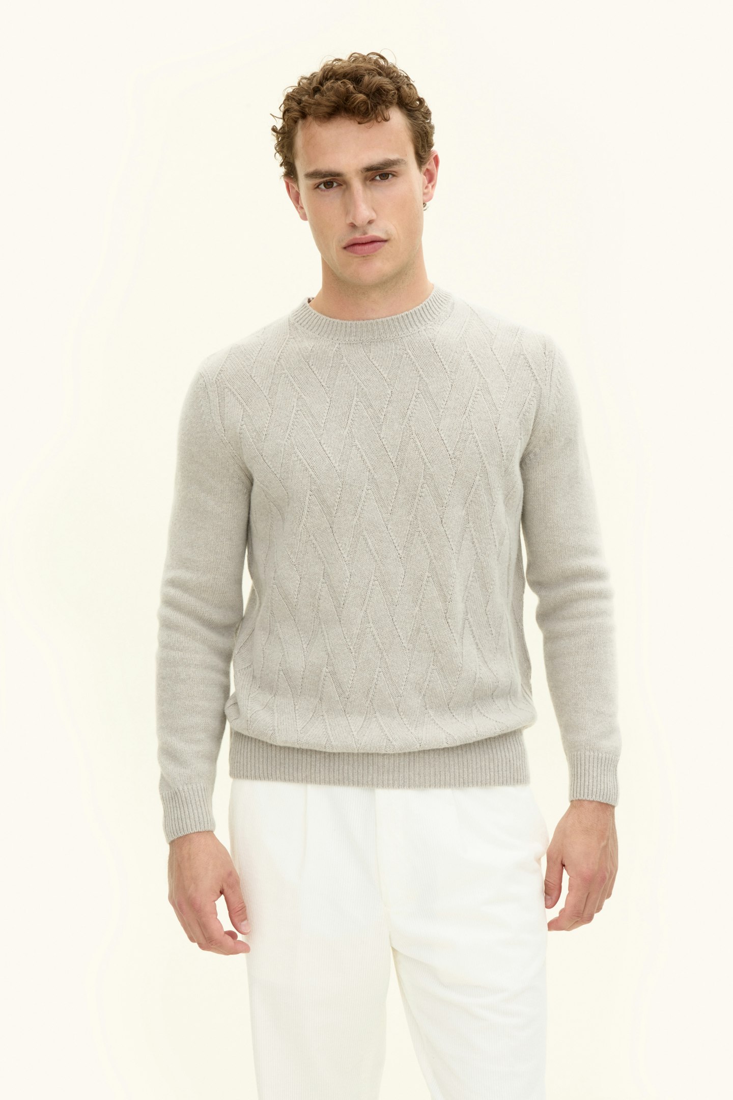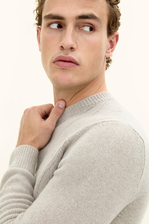Genser med rund hals med unik struktur foran. Laget i en myk blanding av ull, kasjmir og viskose. Strikket i 7gg med 3-lags, som gir et sterkere plagg som er ideelt for kjølige høstdager.