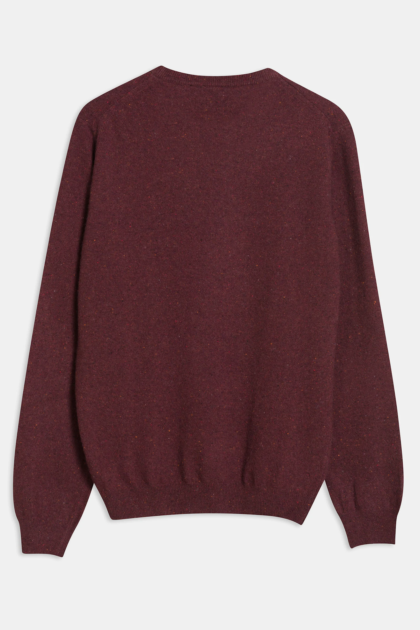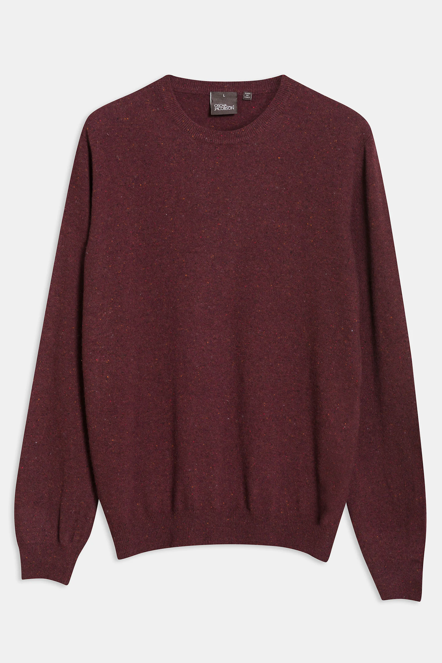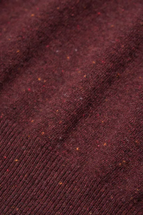 Rundhalset strikkegenser av melert ull, viskose og polyamid.