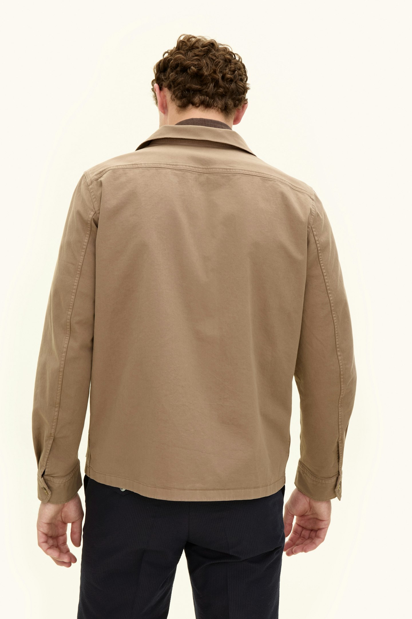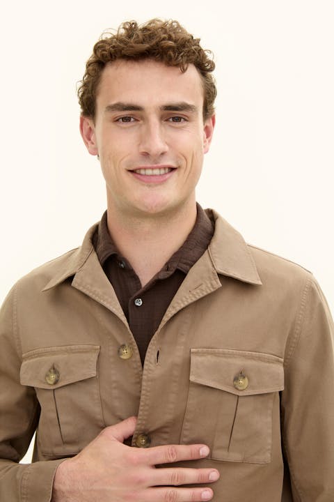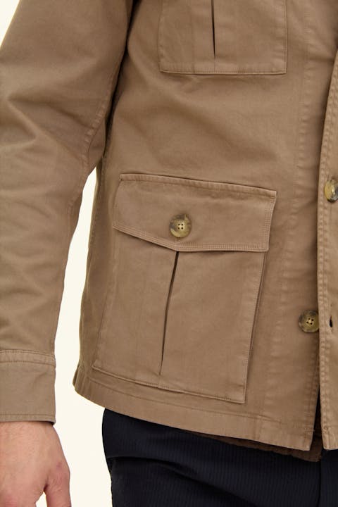 Ufôret skjortejakke i safari-stil med rett passform. Utstyrt med doble utvendige midje- og brystlommer. Stoffet er laget av et robust vasket bomullsmateriale, med litt elastan for ekstra komfort.