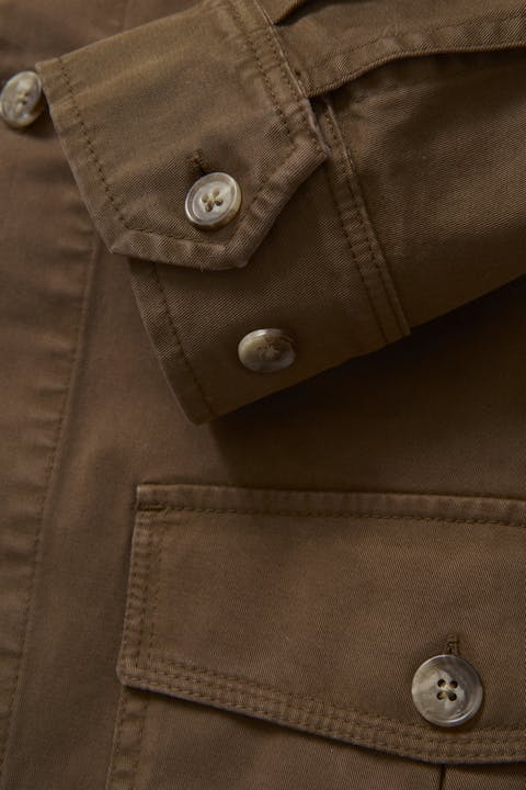 Ufôret skjortejakke i safari-stil med rett passform. Utstyrt med doble utvendige midje- og brystlommer. Stoffet er laget av et robust vasket bomullsmateriale, med litt elastan for ekstra komfort.