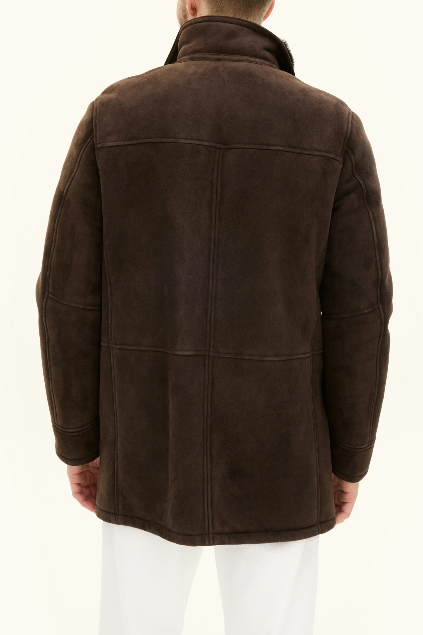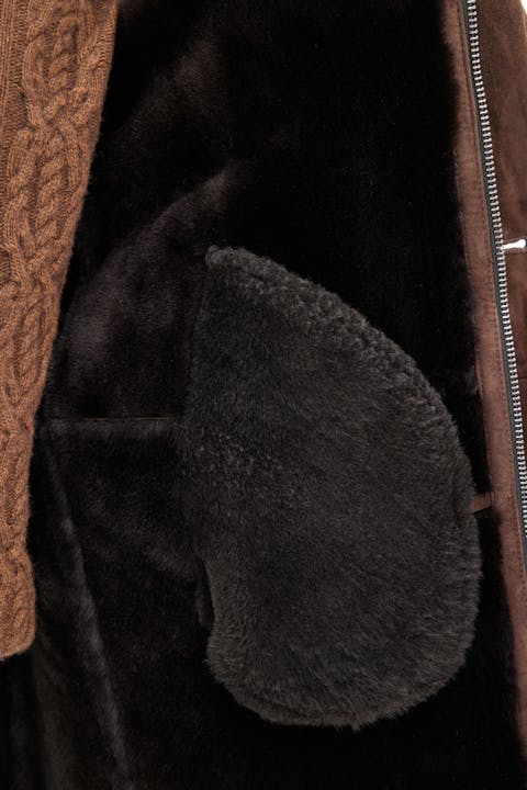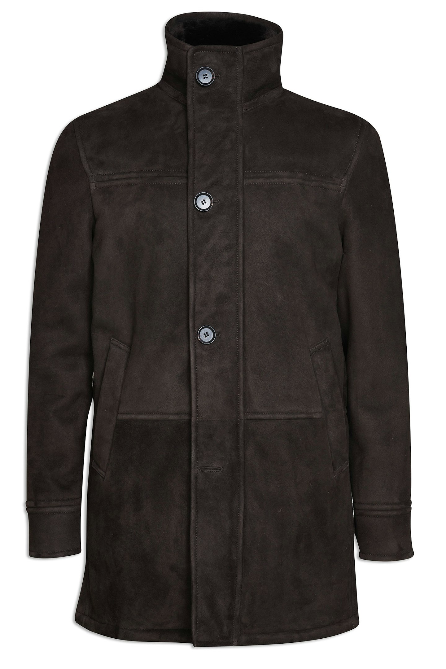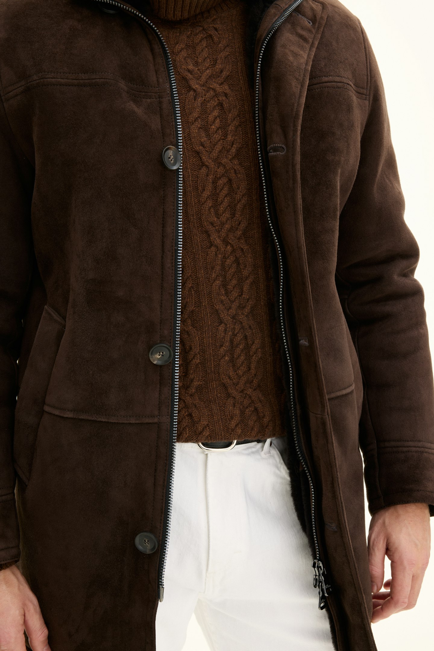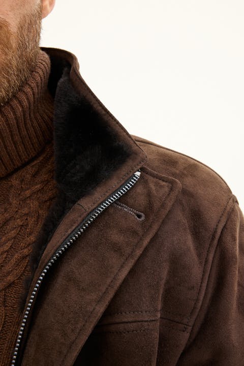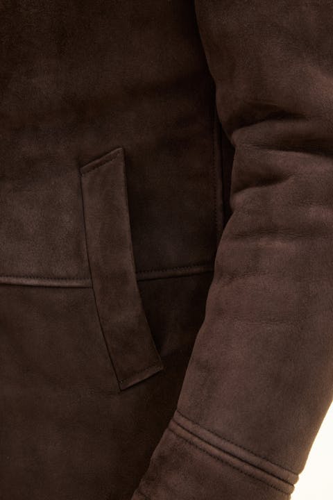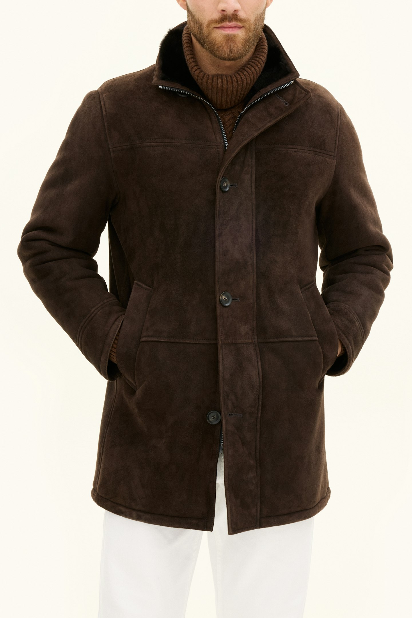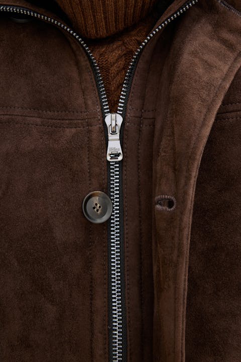 Eksklusiv frakk av lamshearling med ståkrage og skrå lommer. Frakken lukkes ved hjelp av en toveisglidelås, i tillegg til knapper. På utsiden synes det karakteristiske semskede skinnet, samtidig som innsiden preges av myk og varmende lammeull.