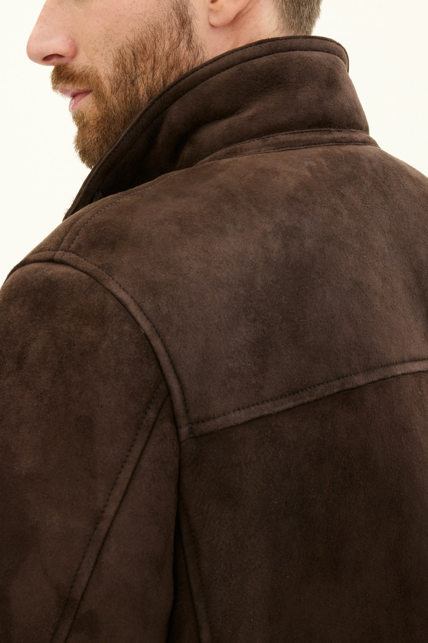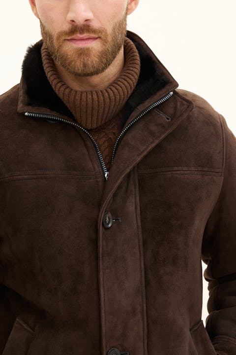 Eksklusiv frakk av lamshearling med ståkrage og skrå lommer. Frakken lukkes ved hjelp av en toveisglidelås, i tillegg til knapper. På utsiden synes det karakteristiske semskede skinnet, samtidig som innsiden preges av myk og varmende lammeull.