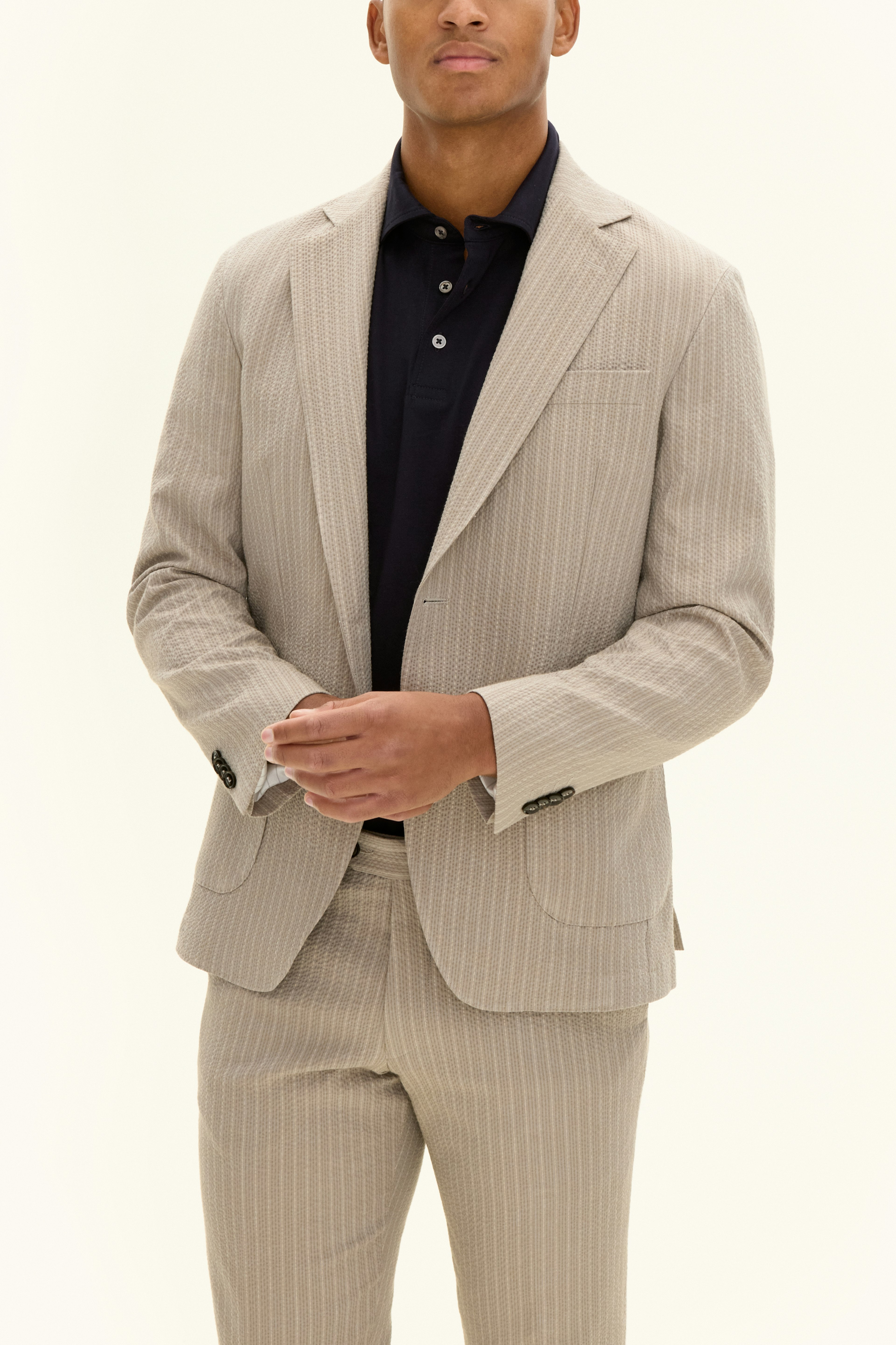 Laget av en myk bomullsblanding, har denne blazeren en regular fit. Den er designet med et tidløst stripemønster og laget med vevd konstruksjon, med en raffinert seersuckertekstur. Perfekt for en smart-casual stil året rundt.