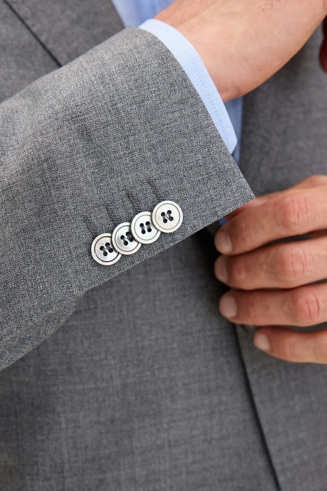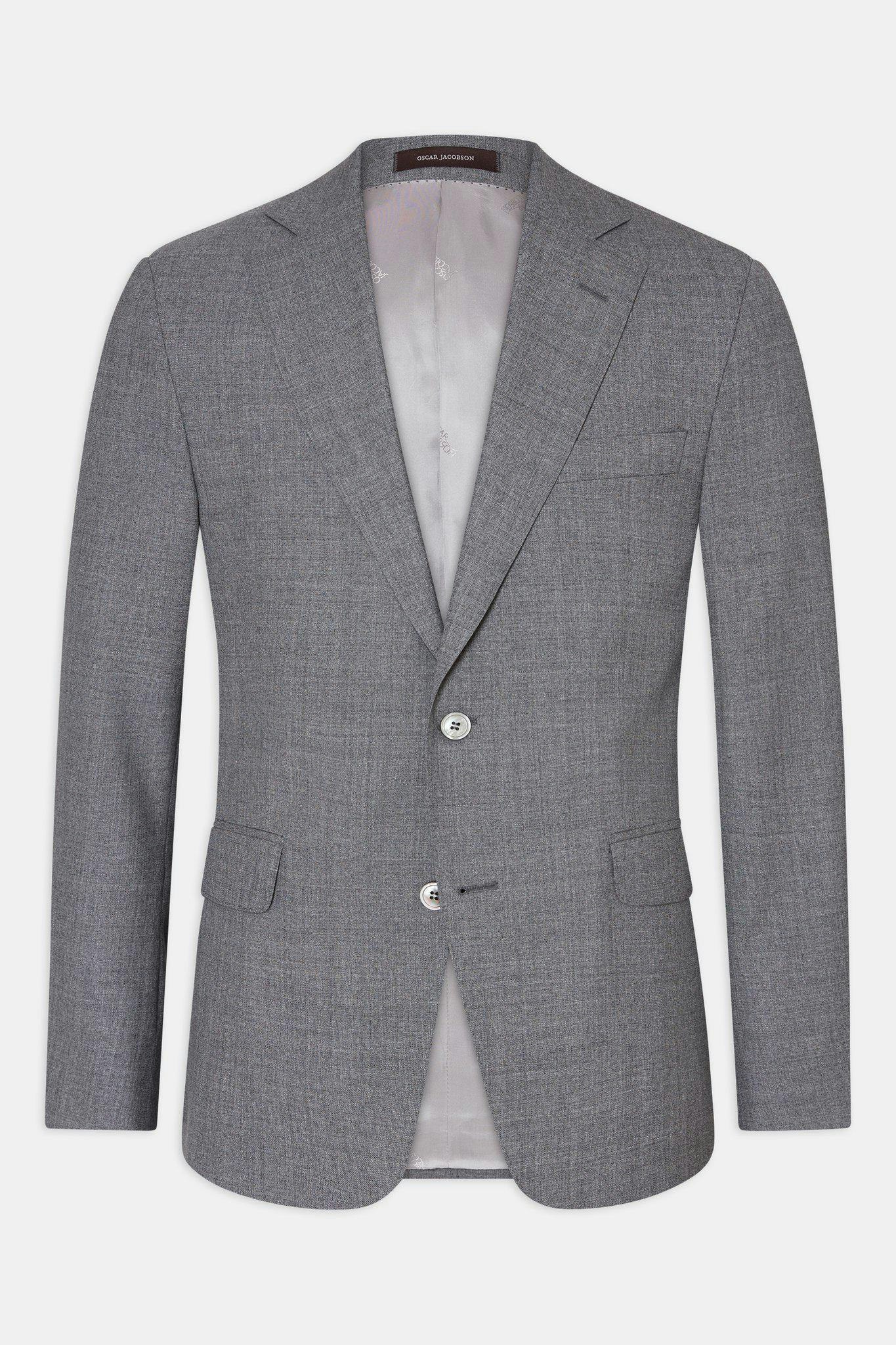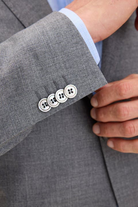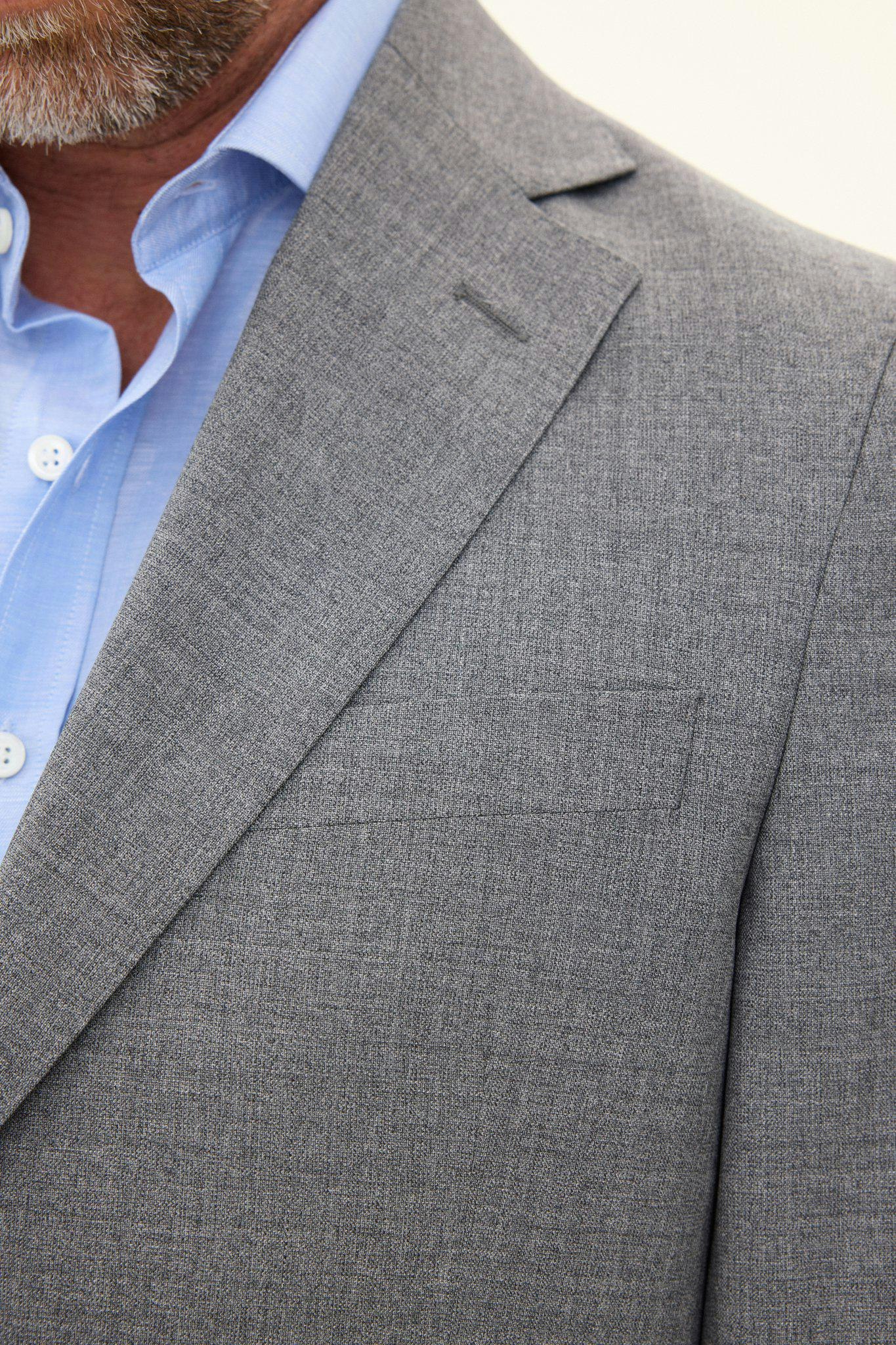 Klubbkostym i mørkeblått ullgarn med struktur fra det italienske veveriet Marzotto. En myk konstruksjon der mellomlegg og skulderoppbygging er nærmest fraværende. Jakken er foret og har lommer med klaff. Tilhørende bukser har en klassisk, noe avsmalnende passform og en normalhøy midje.