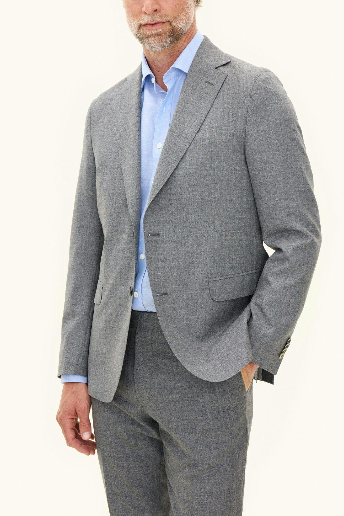 Klubbkostym i mørkeblått ullgarn med struktur fra det italienske veveriet Marzotto. En myk konstruksjon der mellomlegg og skulderoppbygging er nærmest fraværende. Jakken er foret og har lommer med klaff. Tilhørende bukser har en klassisk, noe avsmalnende passform og en normalhøy midje.