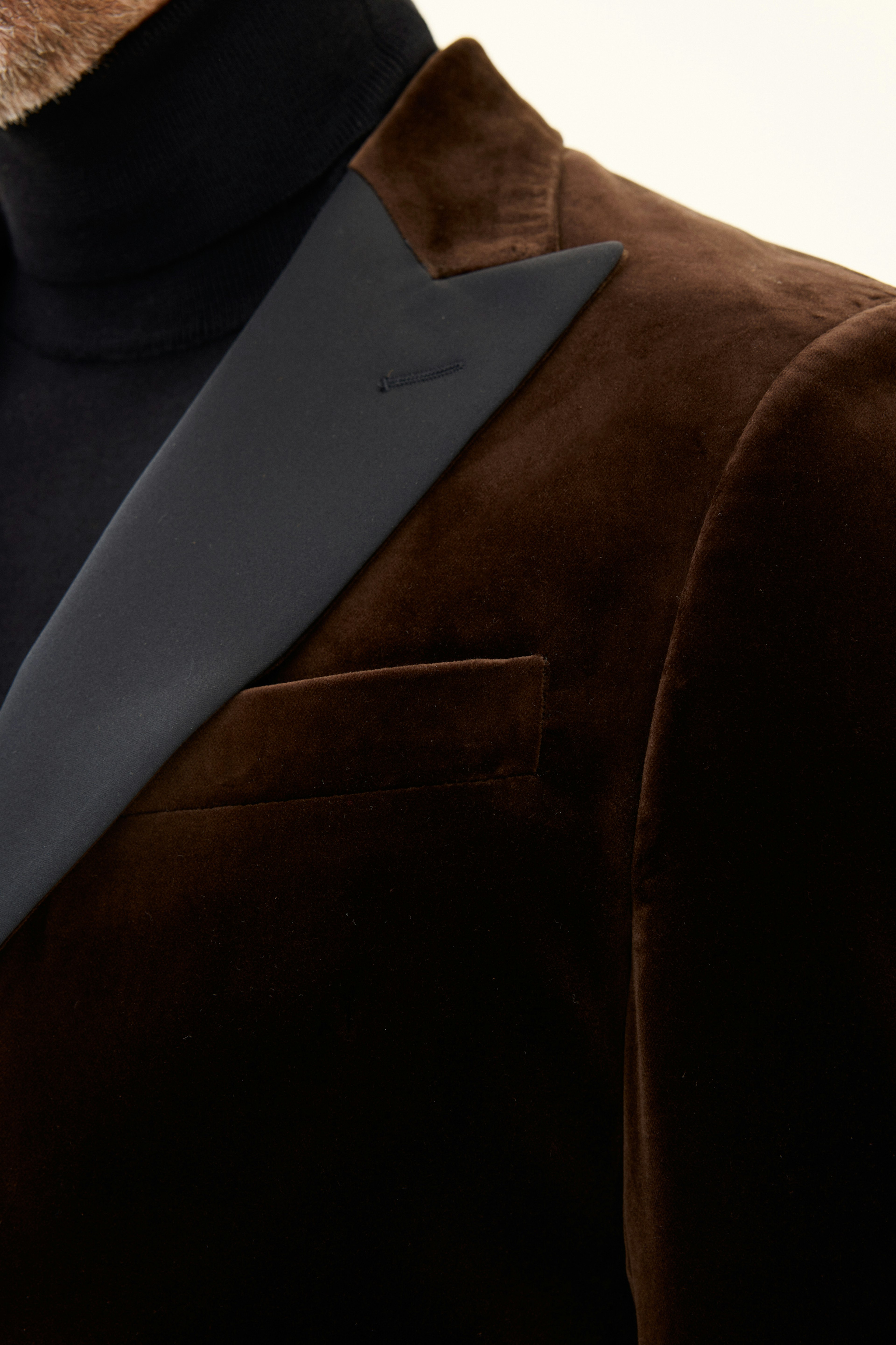 Tuxedo i fløyel med spisse silkeslag. Laget av bomull fra veverne Pontogilo. Normal passform som gir en moderne silhuett uten å føles for stram. Innsiden er helfôret i viskose for økt komfort og en deilig følelse.