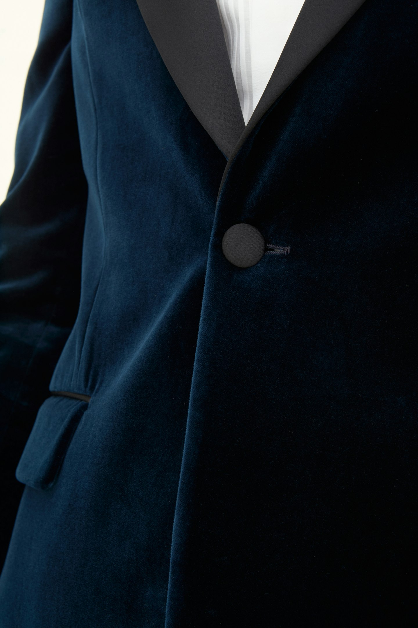 Tuxedo i fløyel med spisse silkeslag. Laget av bomull fra veverne Pontogilo. Normal passform som gir en moderne silhuett uten å føles for stram. Innsiden er helfôret i viskose for økt komfort og en deilig følelse.