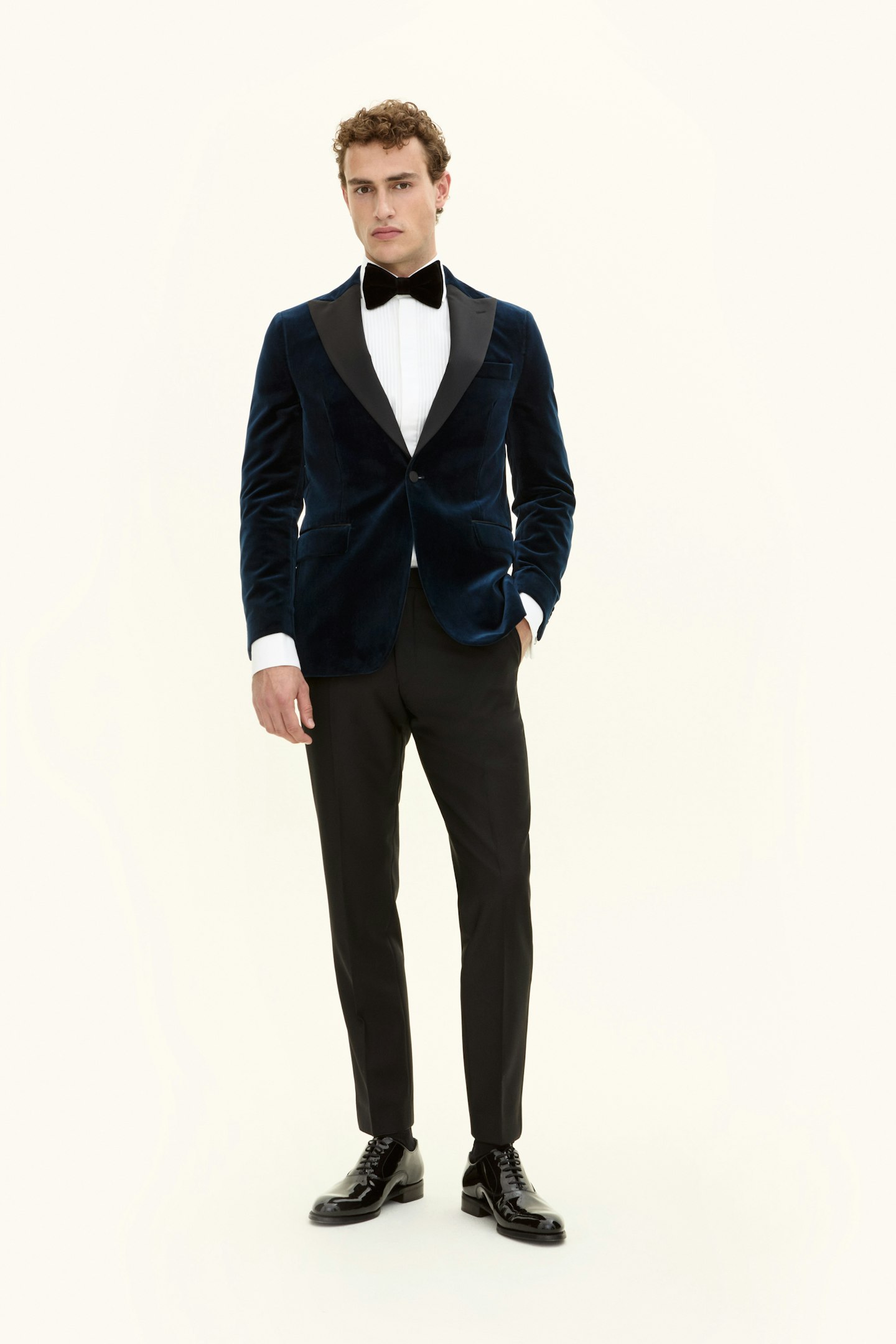 Tuxedo i fløyel med spisse silkeslag. Laget av bomull fra veverne Pontogilo. Normal passform som gir en moderne silhuett uten å føles for stram. Innsiden er helfôret i viskose for økt komfort og en deilig følelse.