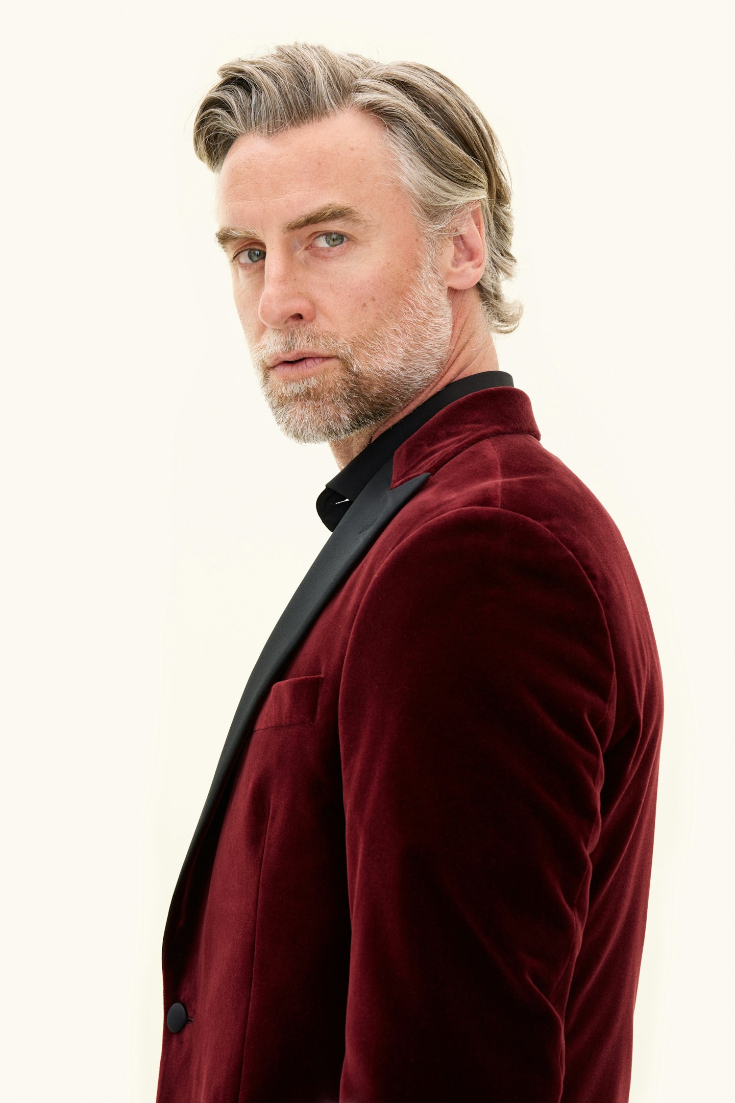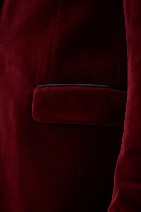 Tuxedo i fløyel med spisse silkeslag. Laget av bomull fra veverne Pontogilo. Normal passform som gir en moderne silhuett uten å føles for stram. Innsiden er helfôret i viskose for økt komfort og en deilig følelse.