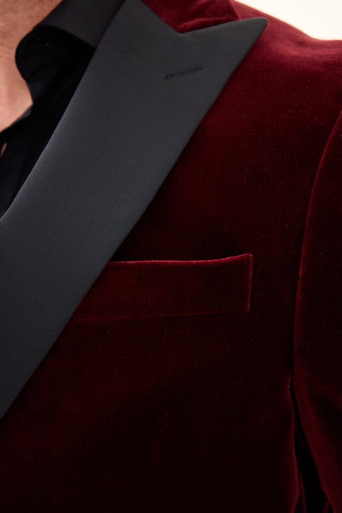 Tuxedo i fløyel med spisse silkeslag. Laget av bomull fra veverne Pontogilo. Normal passform som gir en moderne silhuett uten å føles for stram. Innsiden er helfôret i viskose for økt komfort og en deilig følelse.