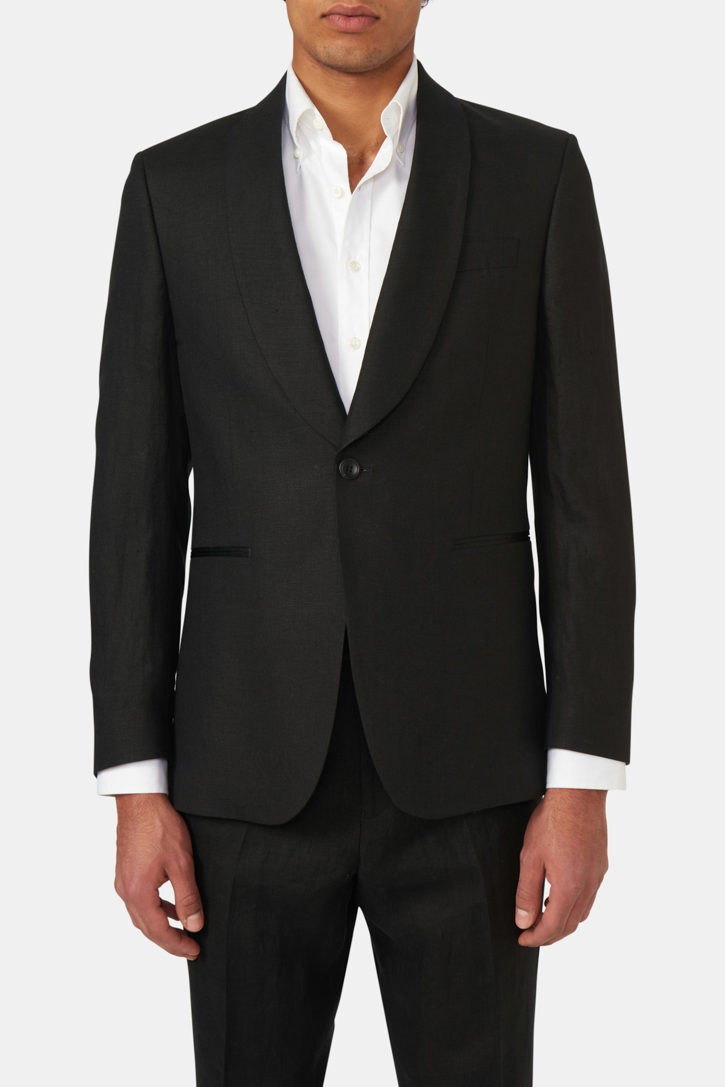 Enkeltspent smokingblazer i regular fit med konstruert skulder og helfôret innside. Blazeren er utstyrt med sjalkrage og passepoilerte lommer. Laget av et 100 % linstoff.