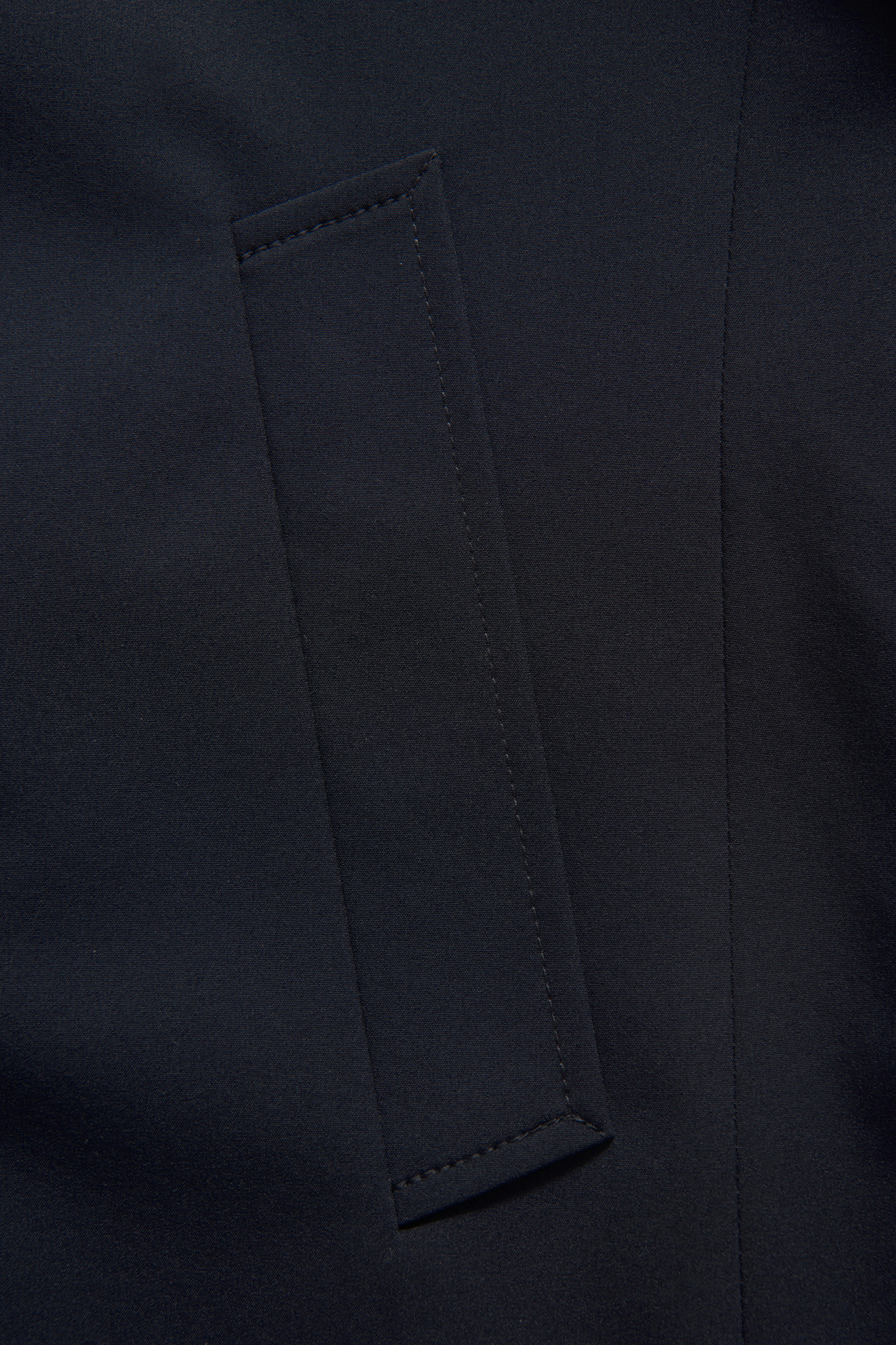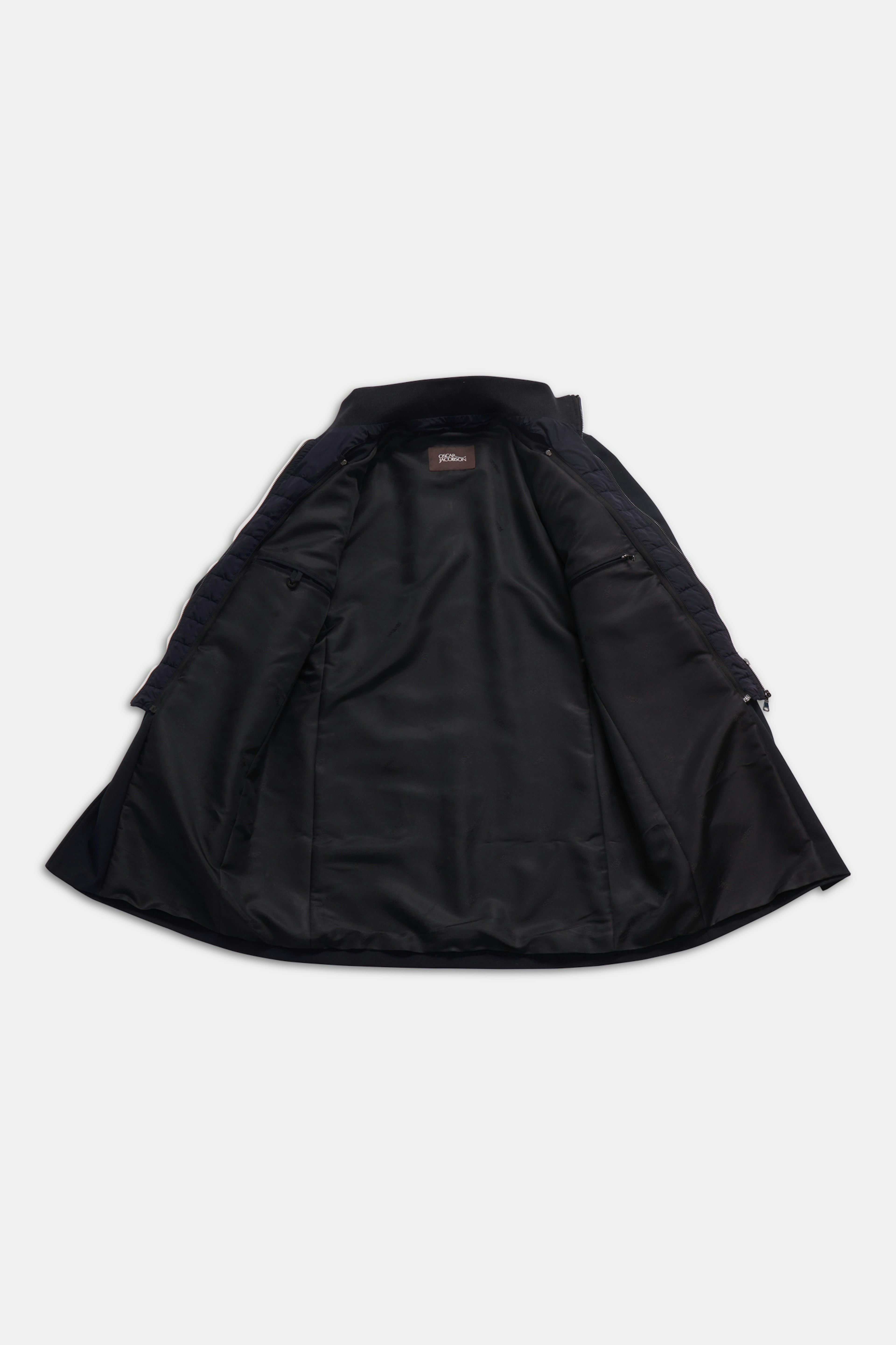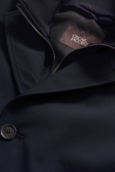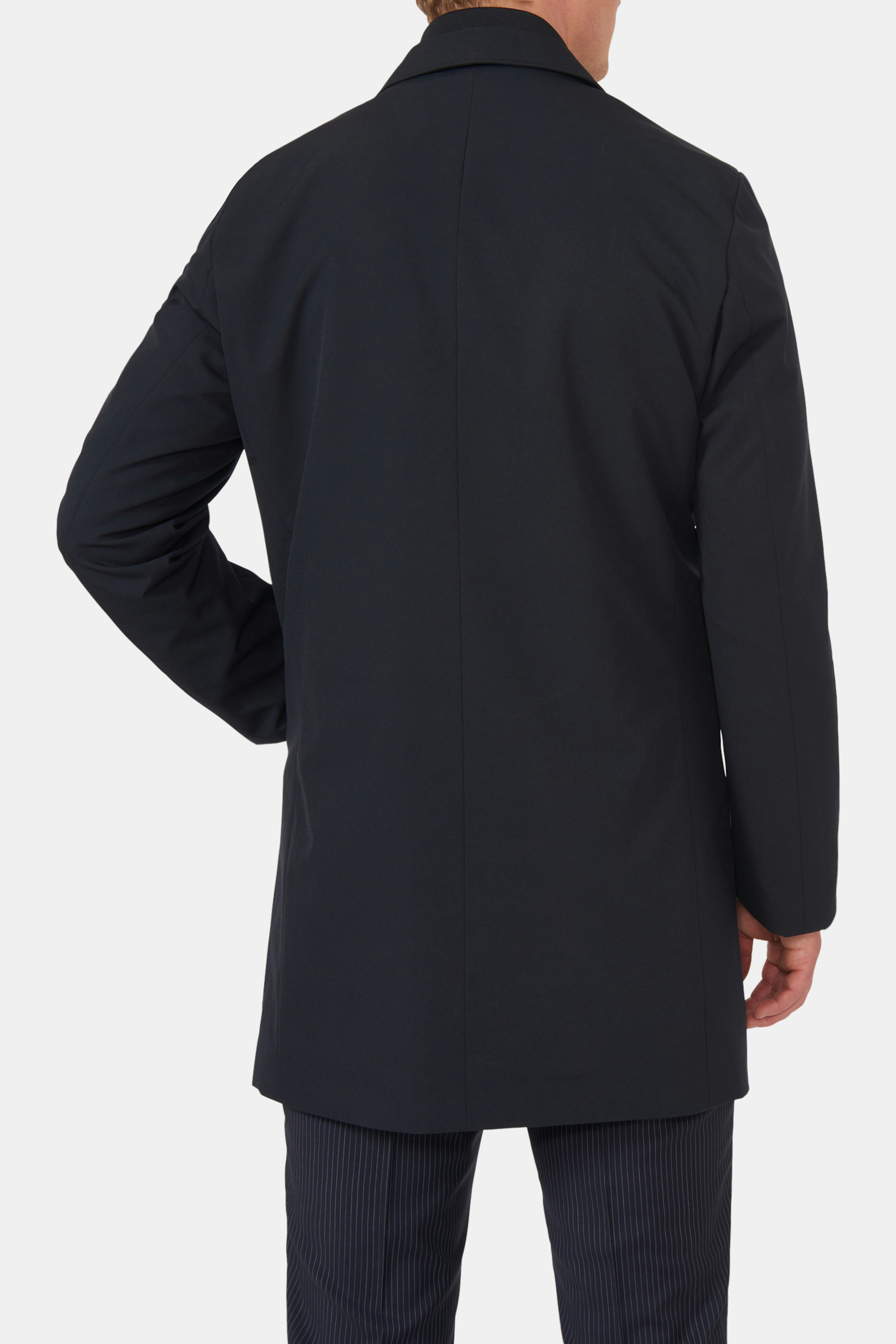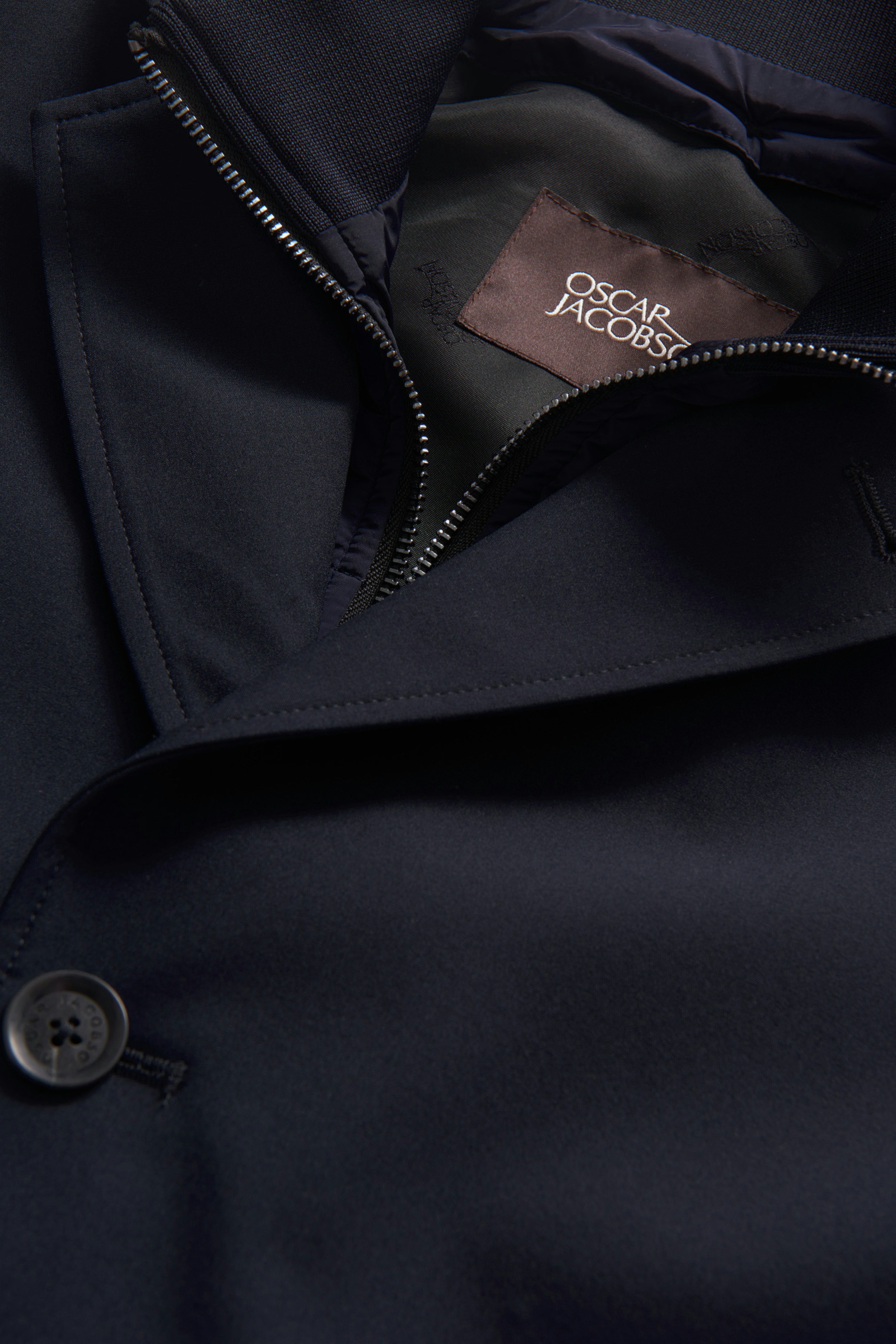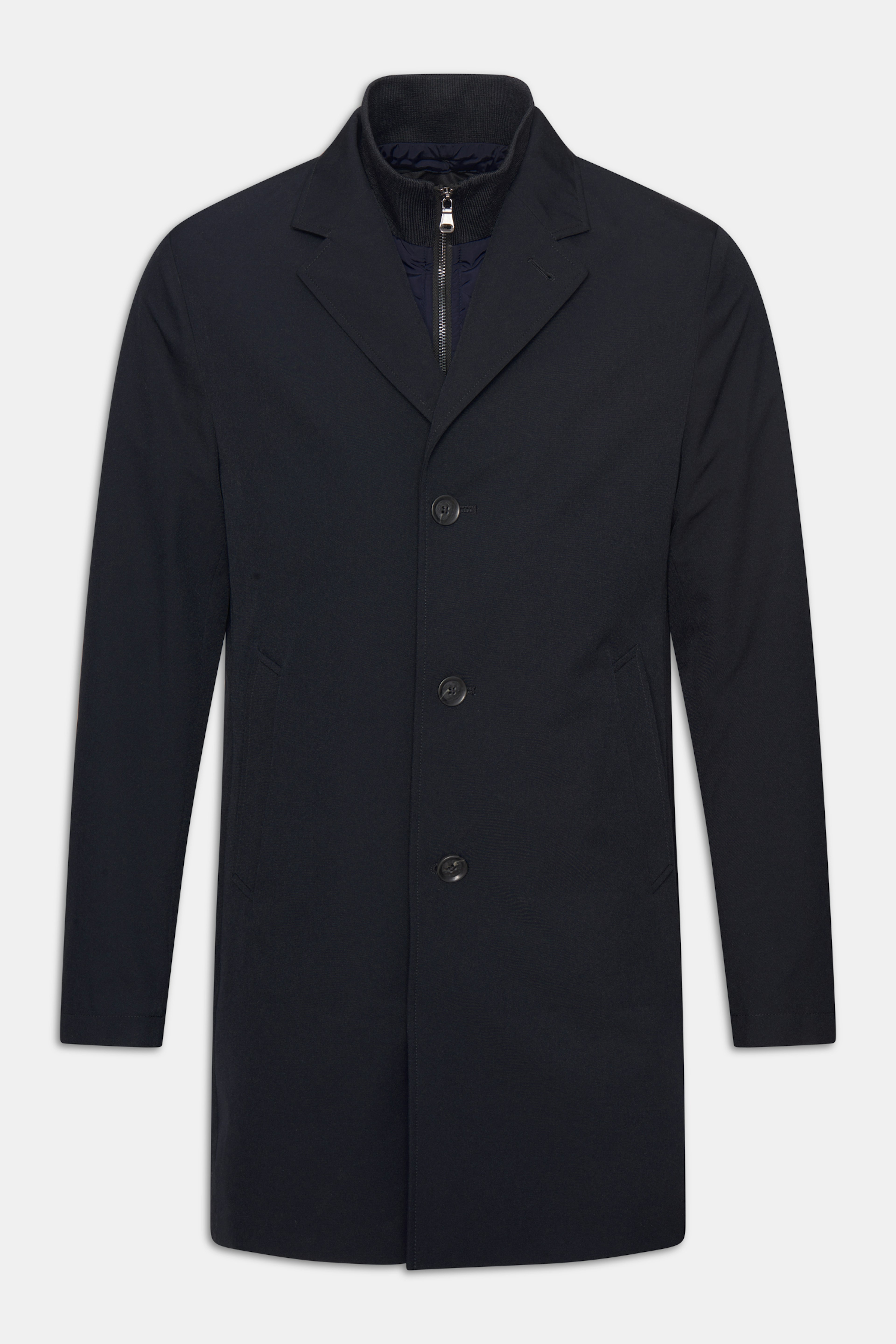 Enkeltspent tynn vår- og høstfrakk med helfôr, doble innerlommer og innebygget vest. Laget av et vanntett materiale.