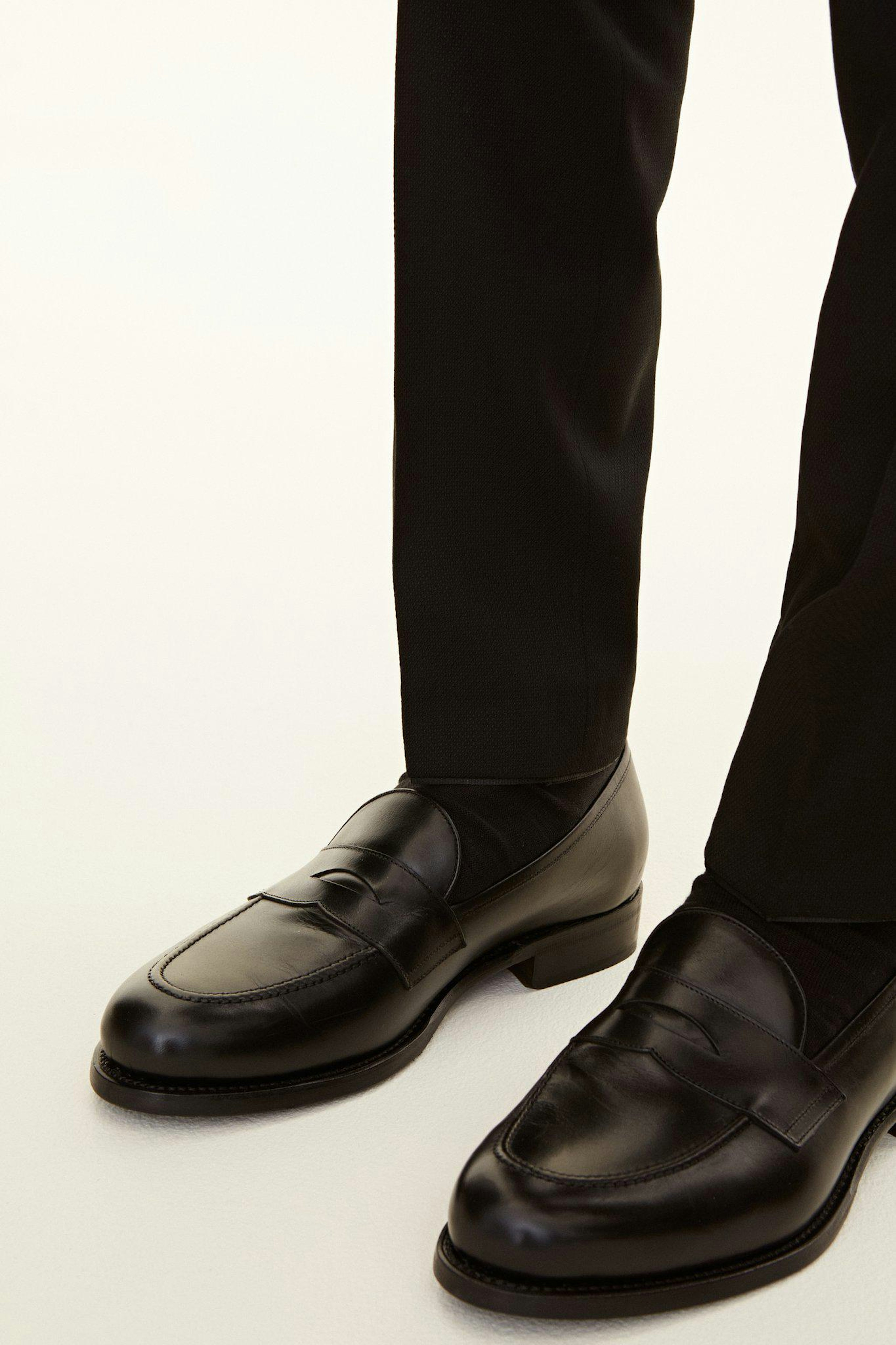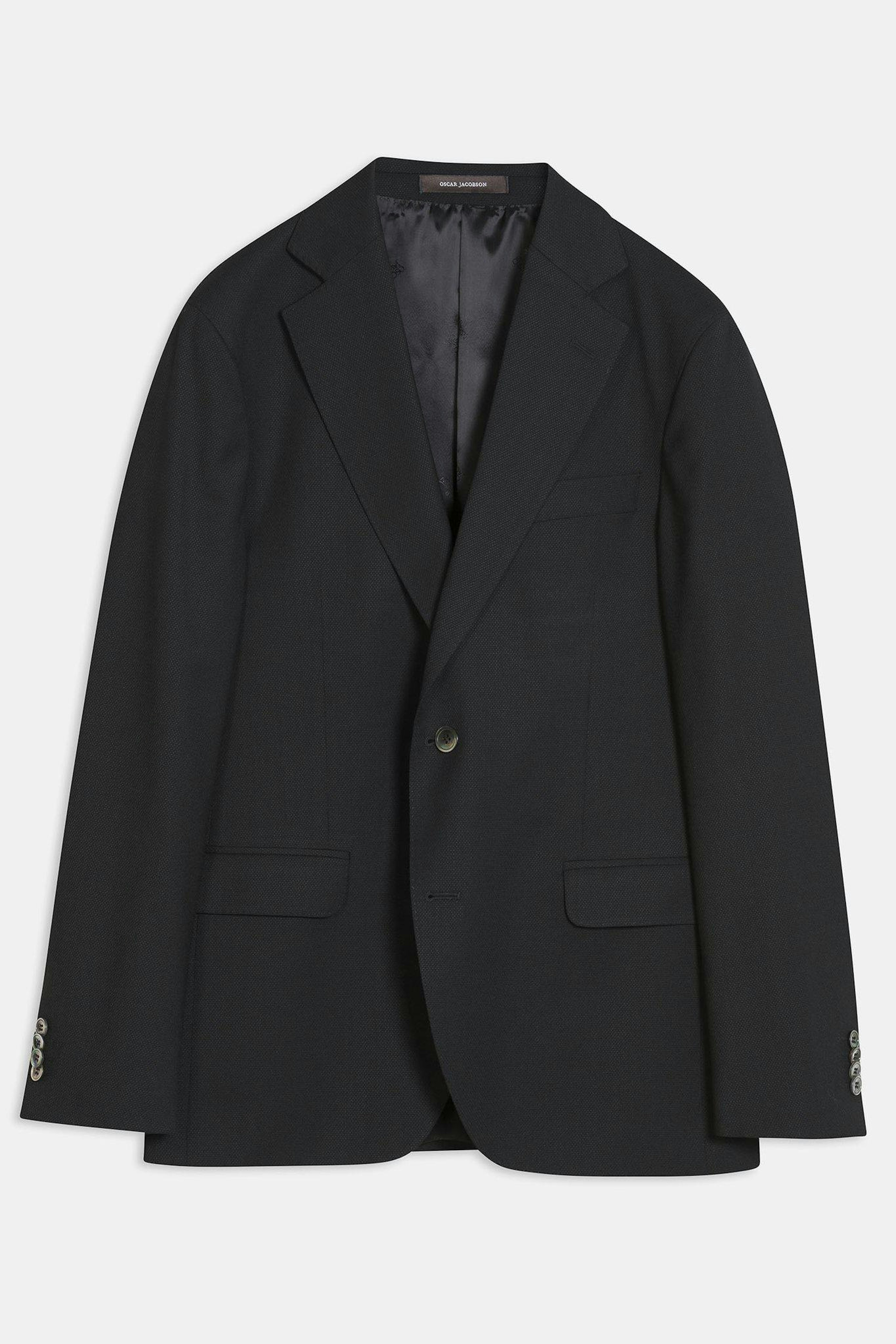 Klubbkostym i mørkeblått ullgarn med struktur fra det italienske veveriet Marzotto. En myk konstruksjon der mellomlegg og skulderoppbygging er nærmest fraværende. Jakken er foret og har lommer med klaff. Tilhørende bukser har en klassisk, noe avsmalnende passform og en normalhøy midje.