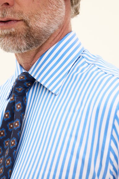Denne regular fit-skjorten er sydd i 100 % bomullstwill med et subtilt stripemønster. Den klassiske turndown-kragen og enkle mansjetten gir et elegant og tidløst uttrykk. En allsidig skjorte som fungerer like godt til dress som til mer avslappede kombinasjoner.