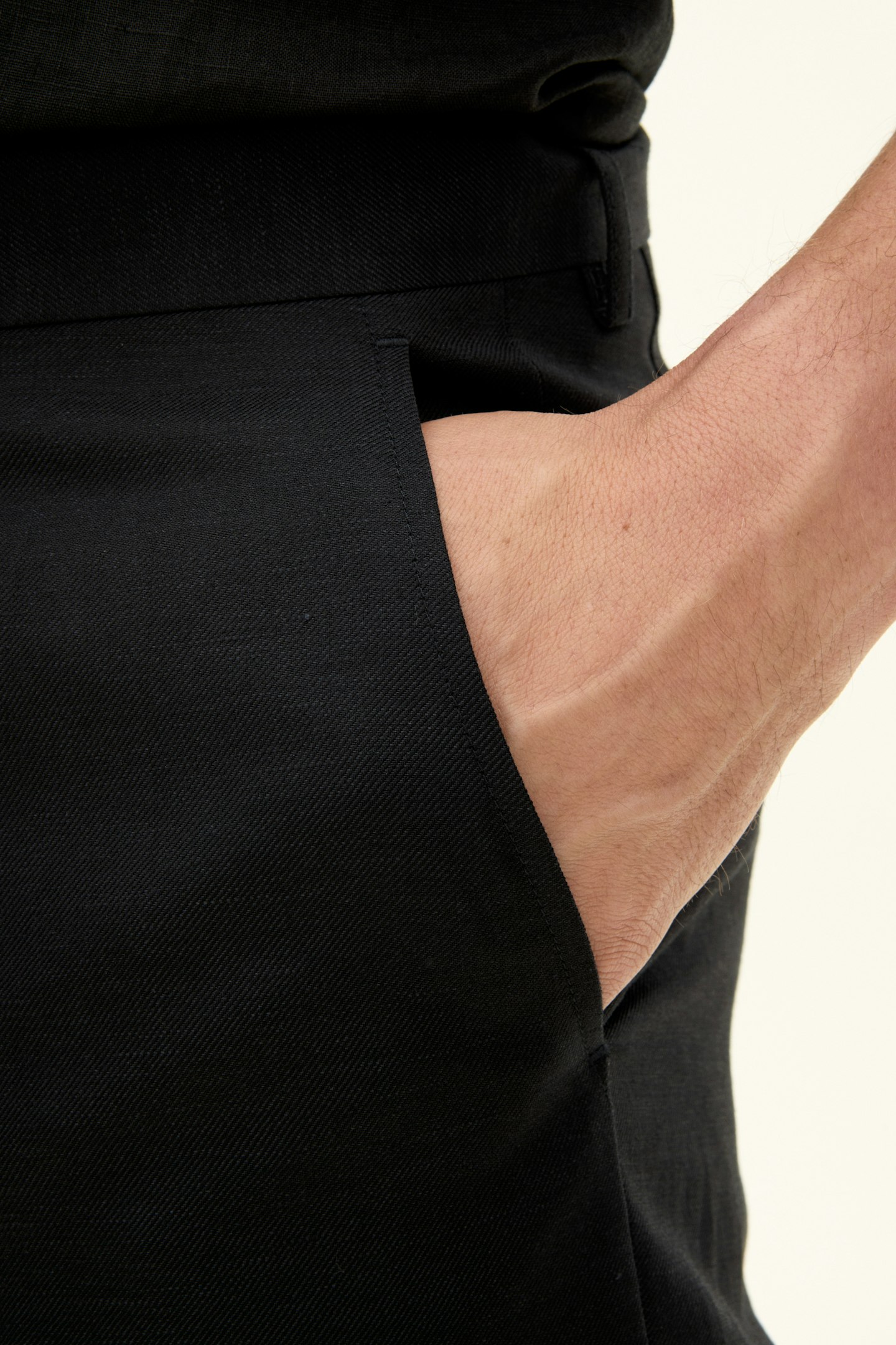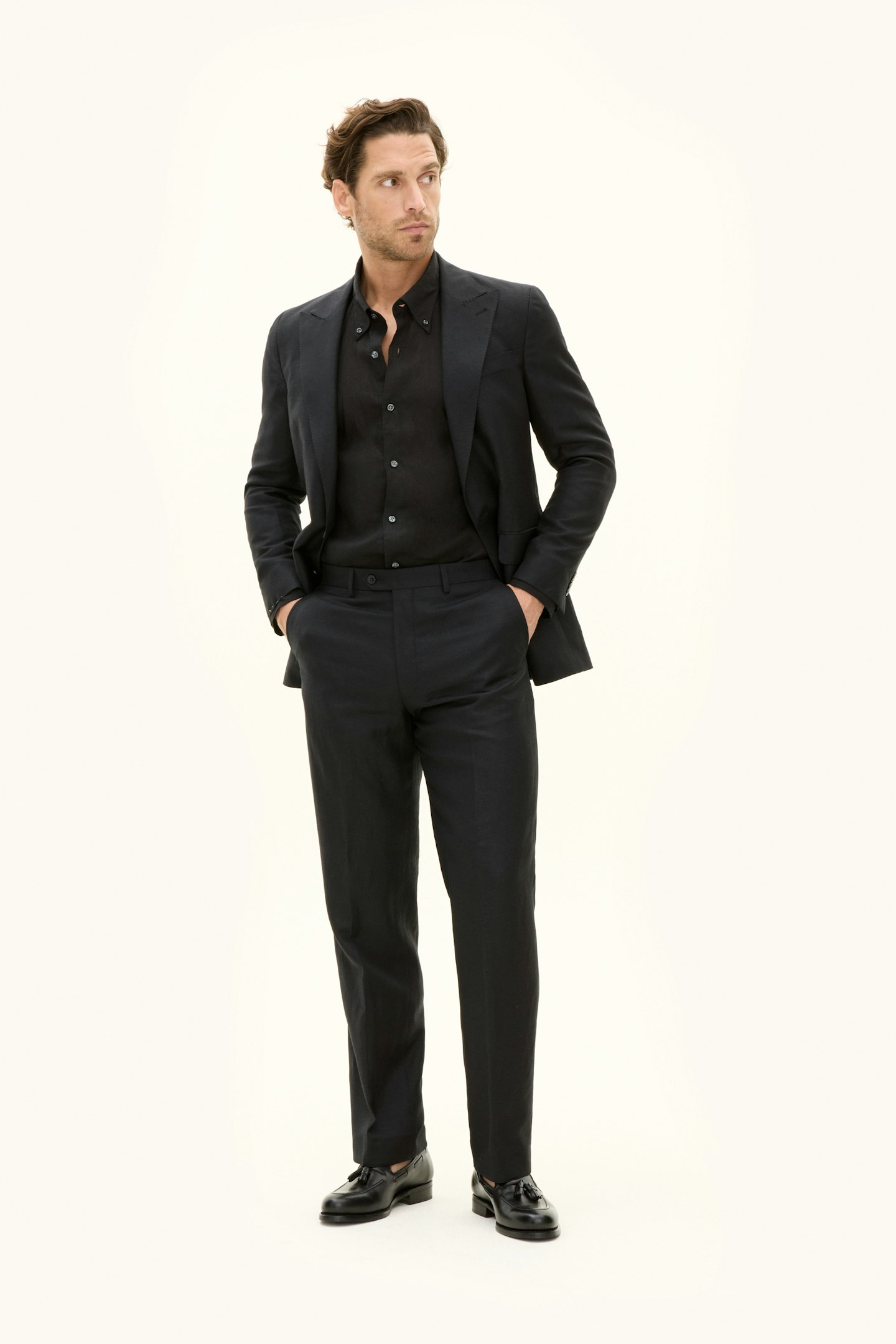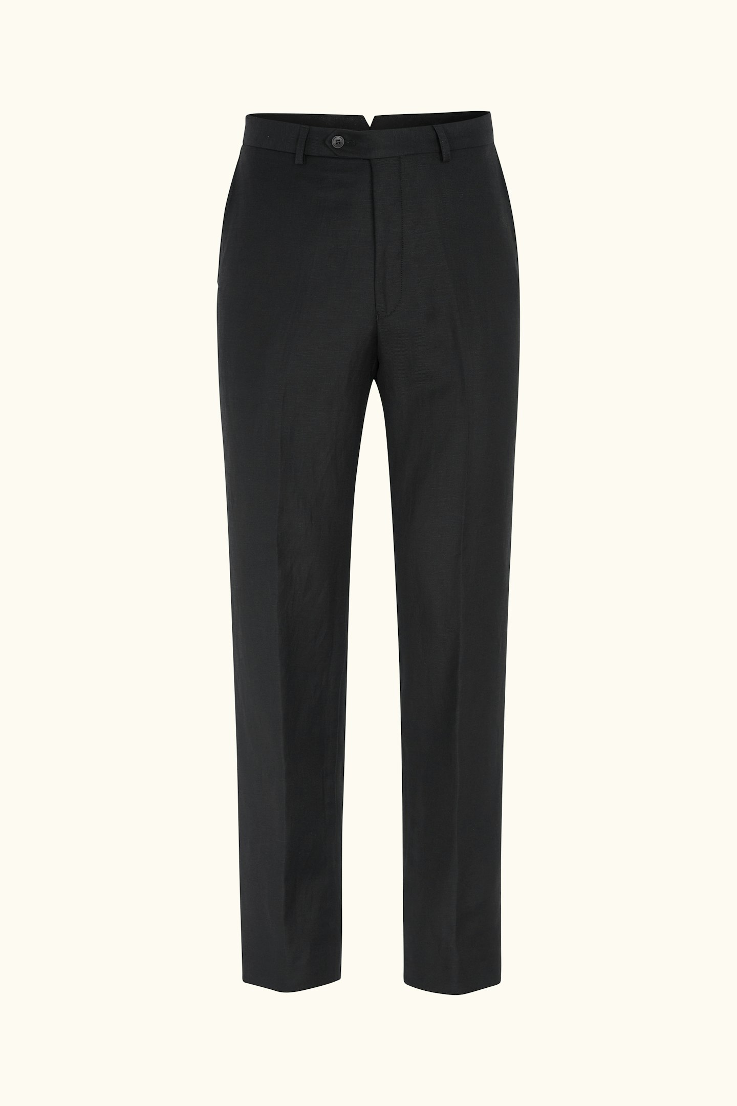 En rett, vid bukse i regular fit, laget i ull/lin-twill fra Sondrio. Kvaliteten har en lett twilltekstur og et mykt fall. Buksen er rundpresset for en mer formet silhuett og har normal midje, press og full lengde. Den er konstruert som en del av en dress, men kan også brukes separat avhengig av anledning.