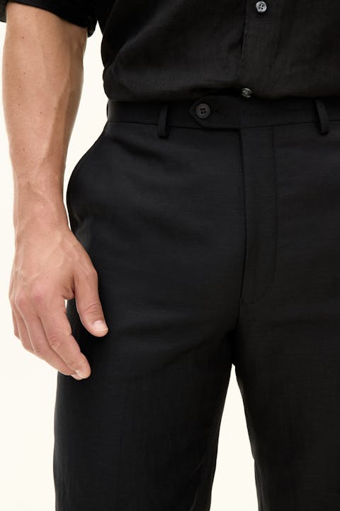 En rett, vid bukse i regular fit, laget i ull/lin-twill fra Sondrio. Kvaliteten har en lett twilltekstur og et mykt fall. Buksen er rundpresset for en mer formet silhuett og har normal midje, press og full lengde. Den er konstruert som en del av en dress, men kan også brukes separat avhengig av anledning.