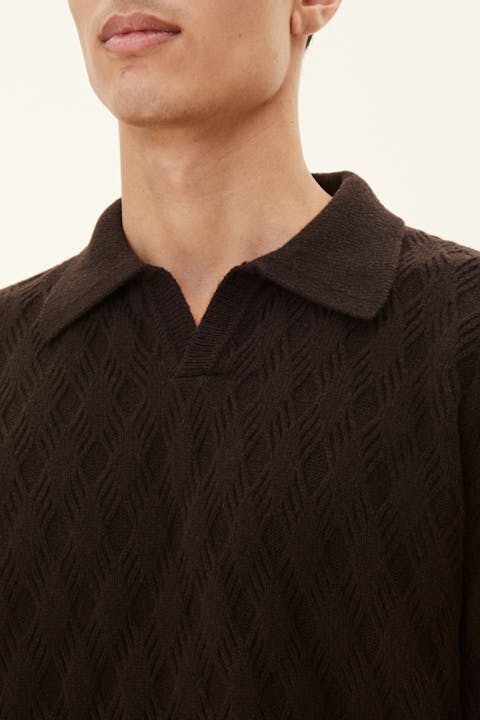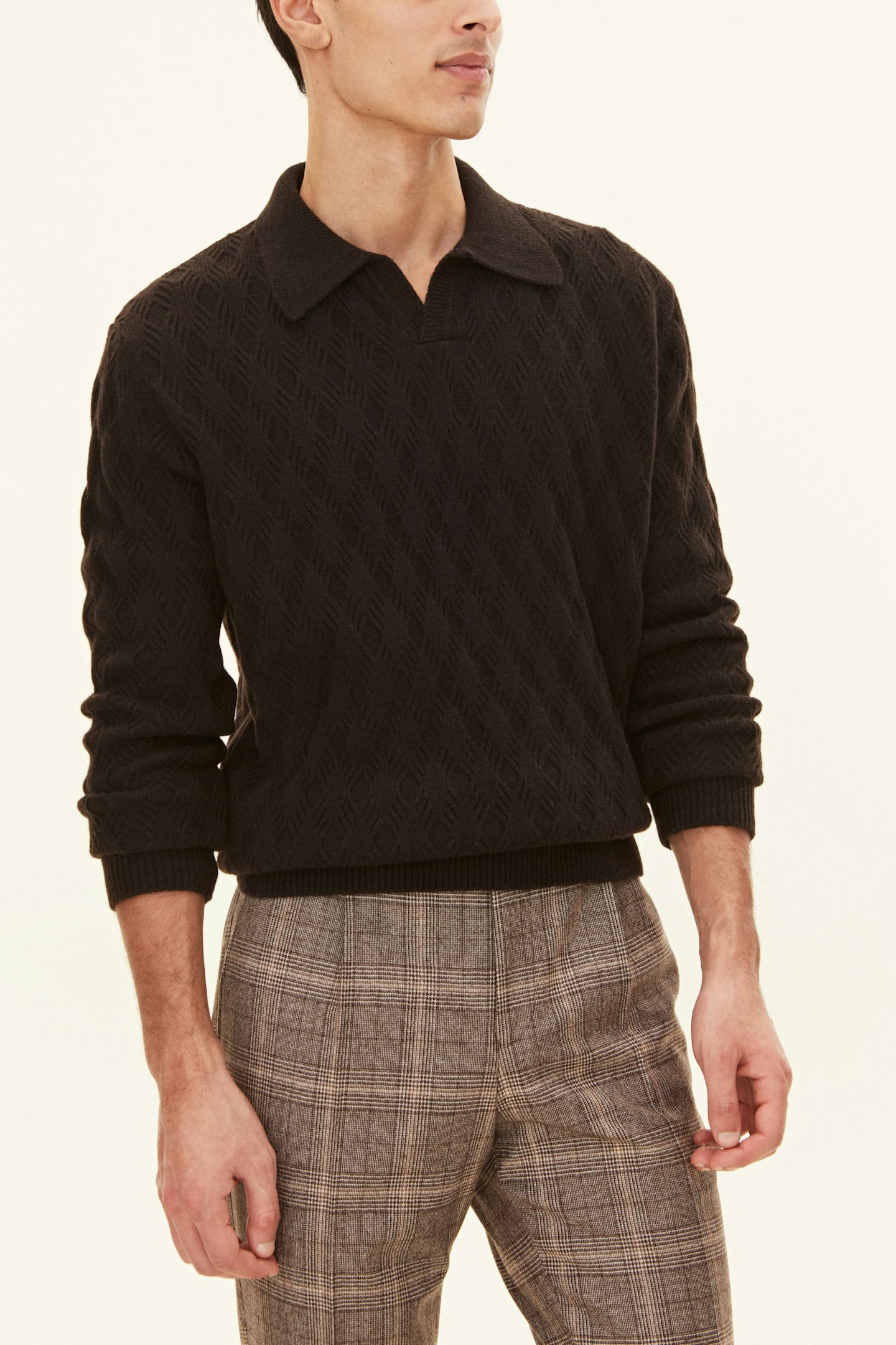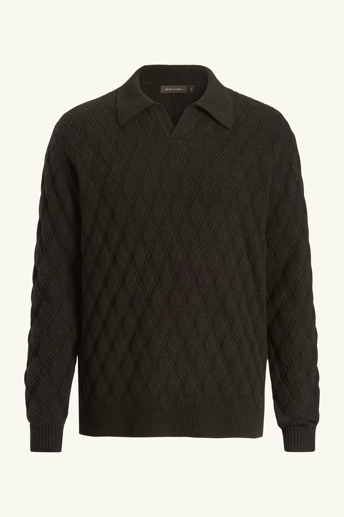 Elegant genser med krage og struktur over hele plagget. Formstrikket krage og strikket i 7gg, som gir et litt tykkere plagg å ha på innendørs. Ull-kashmirblandingen gir både luksus og komfort.