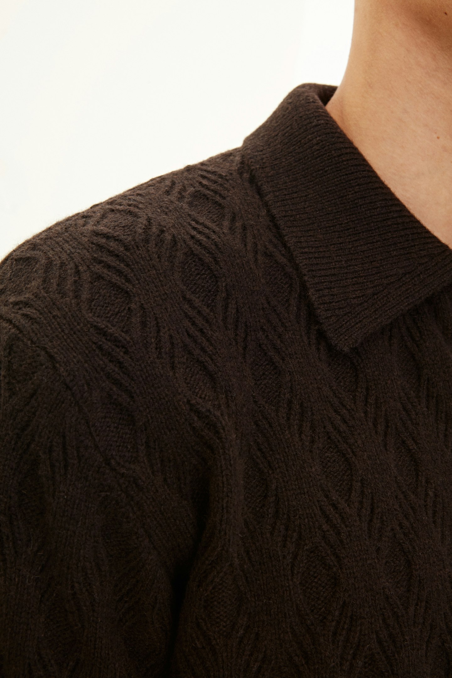 Elegant genser med krage og struktur over hele plagget. Formstrikket krage og strikket i 7gg, som gir et litt tykkere plagg å ha på innendørs. Ull-kashmirblandingen gir både luksus og komfort.