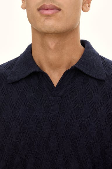 Elegant genser med krage og struktur over hele plagget. Formstrikket krage og strikket i 7gg, som gir et litt tykkere plagg å ha på innendørs. Ull-kashmirblandingen gir både luksus og komfort.