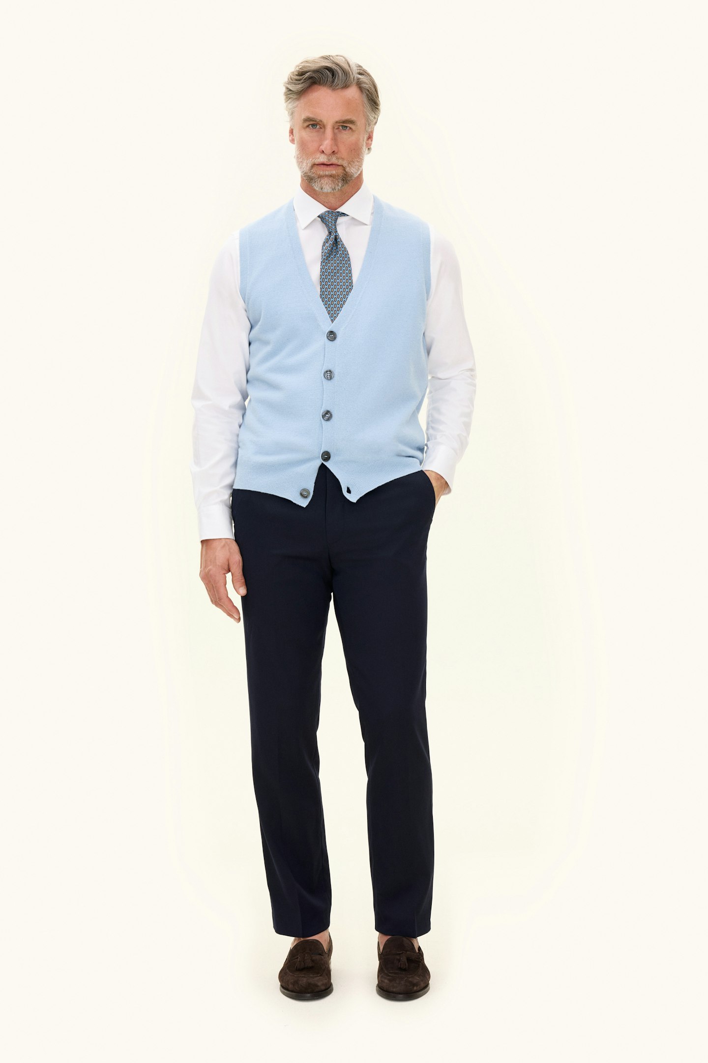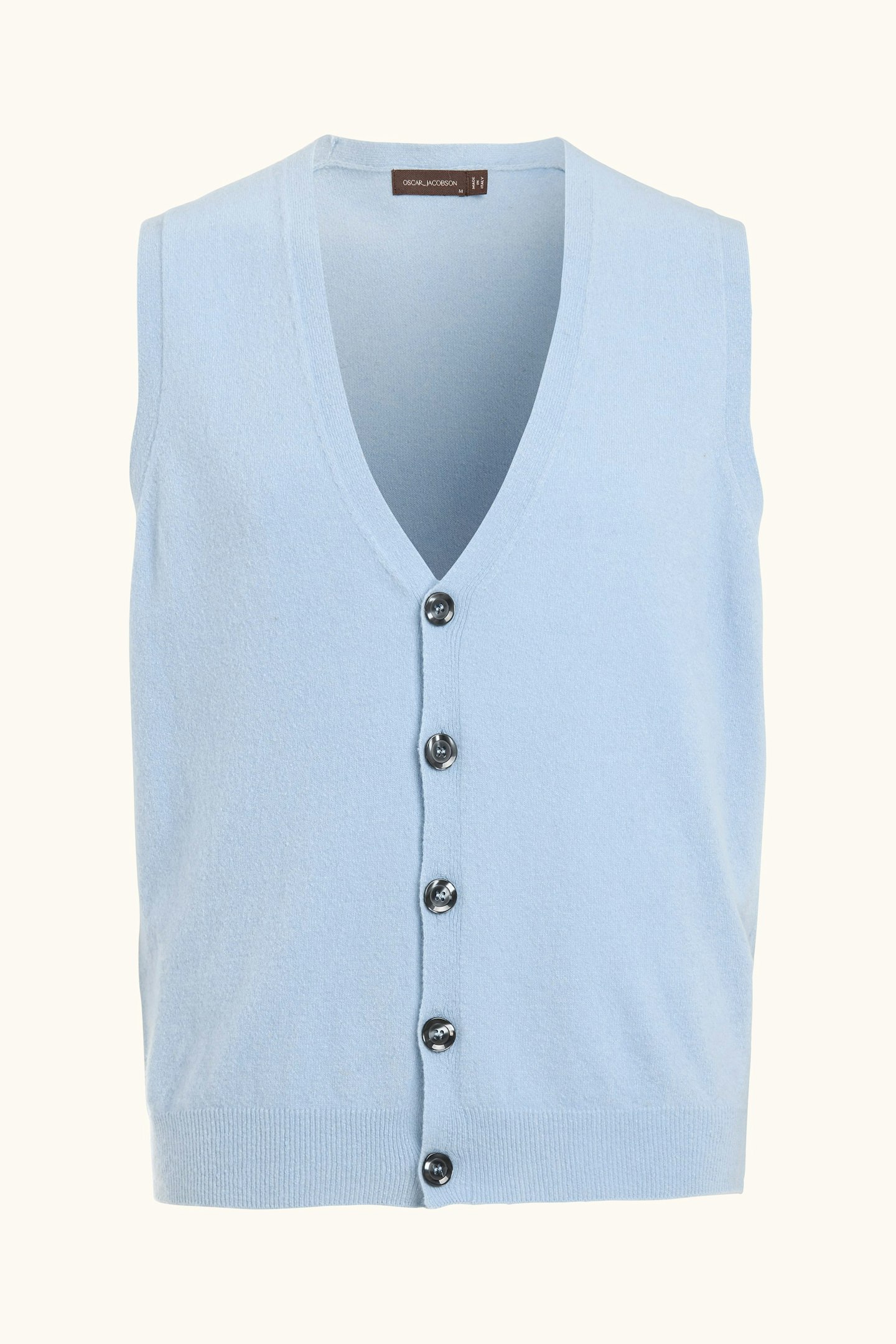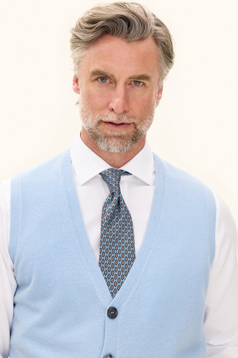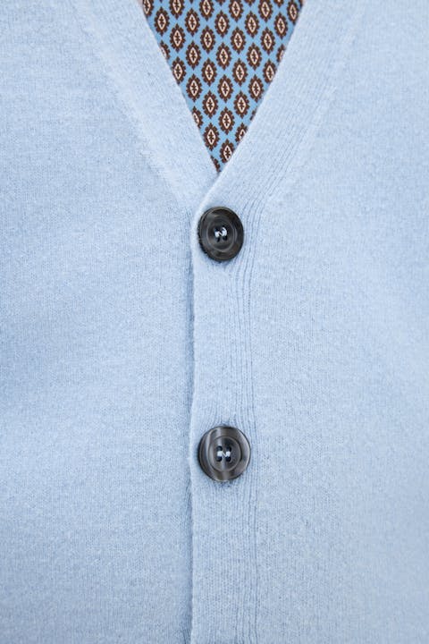 Klassisk vestmodell med grå perlemorsknapper i front. Tradisjonell 1x1-ribb nederst. Passformen er regular fit, noe som gjør den perfekt å bruke både over skjorte og t-skjorte. Myk og behagelig kvalitet med hovedsakelig ull av fineste sort. Strikket i 7gg.