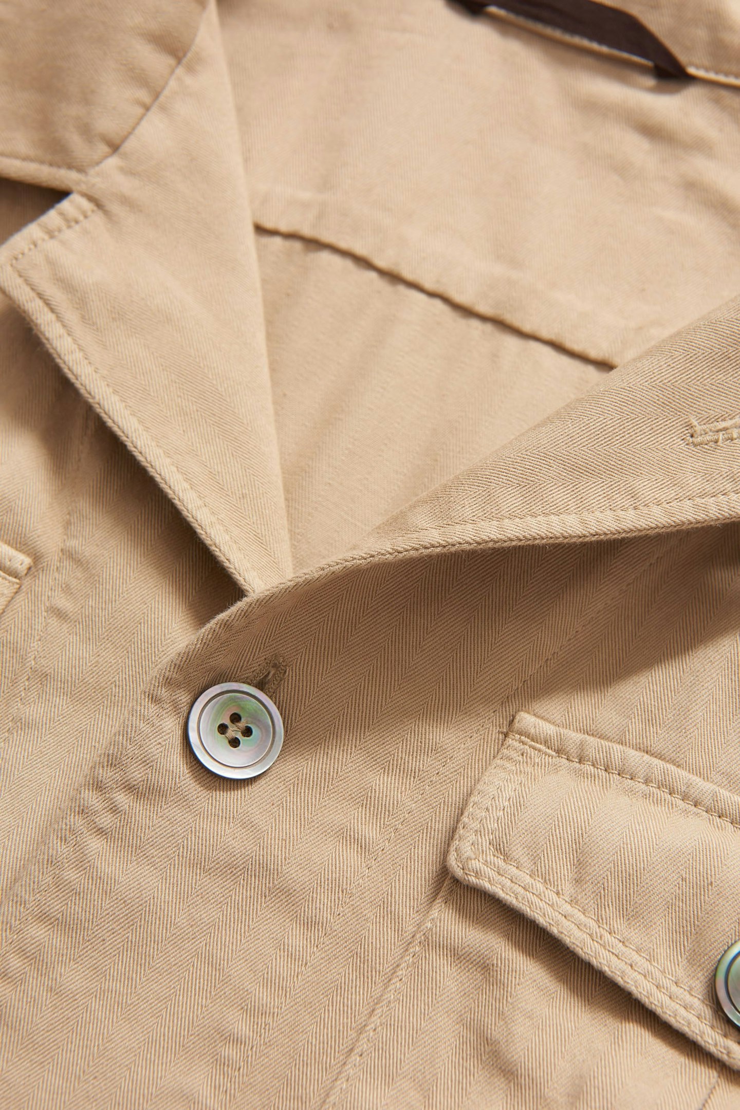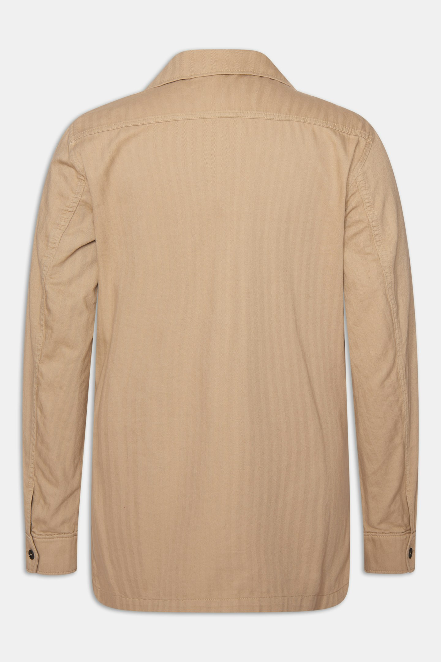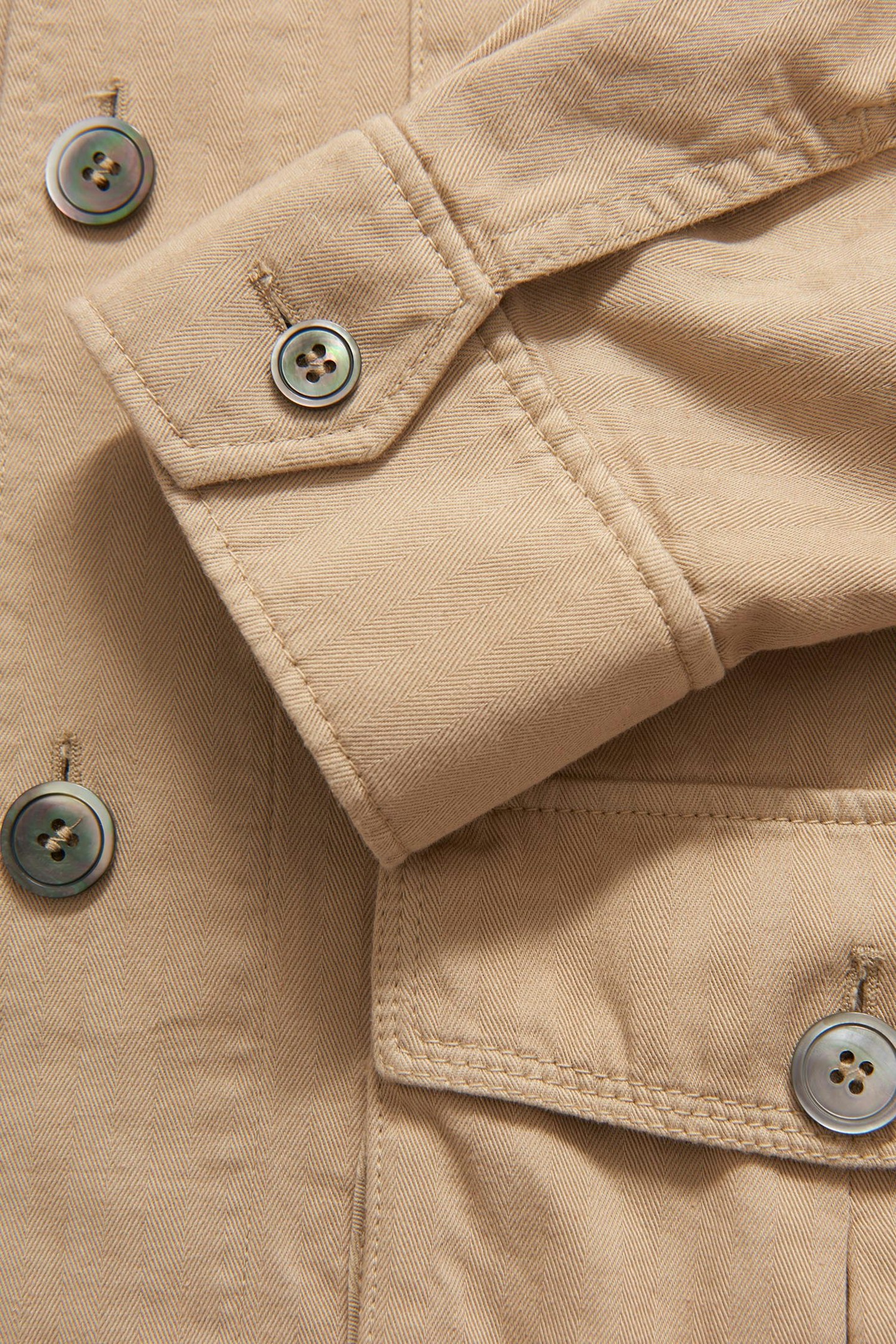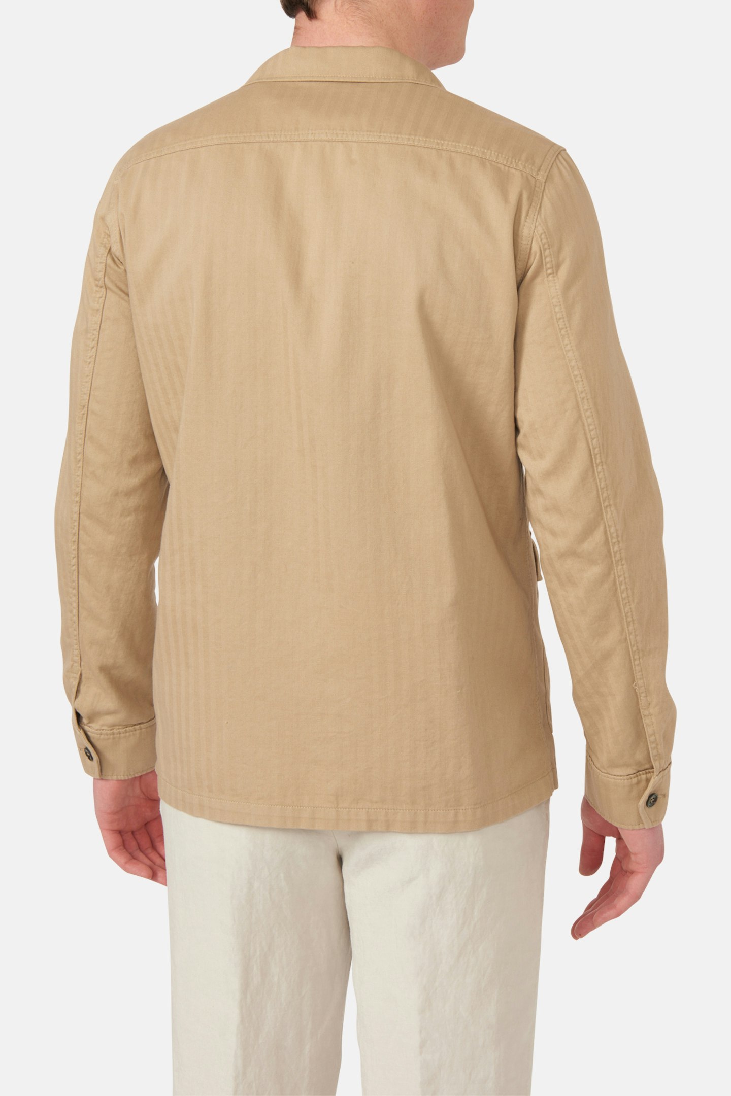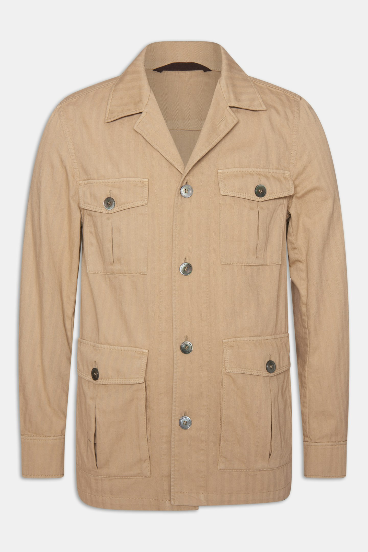 Ufôret skjortejakke i safari-stil med rett passform. Utstyrt med doble utvendige midje- og brystlommer og ekte perlemorsknapper. Stoffet er laget av et robust bomullsmateriale med en diskret fiskebeinsstruktur.