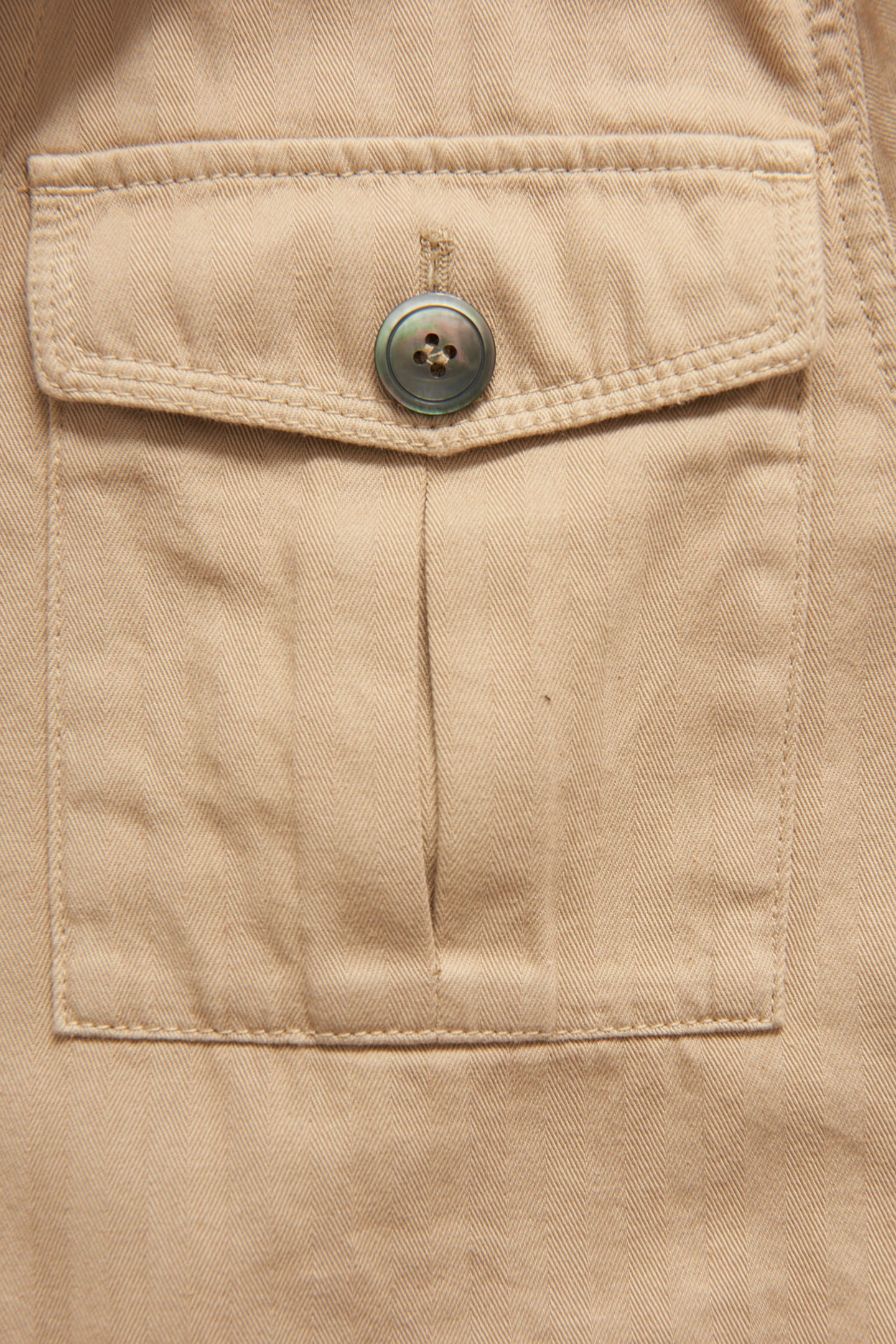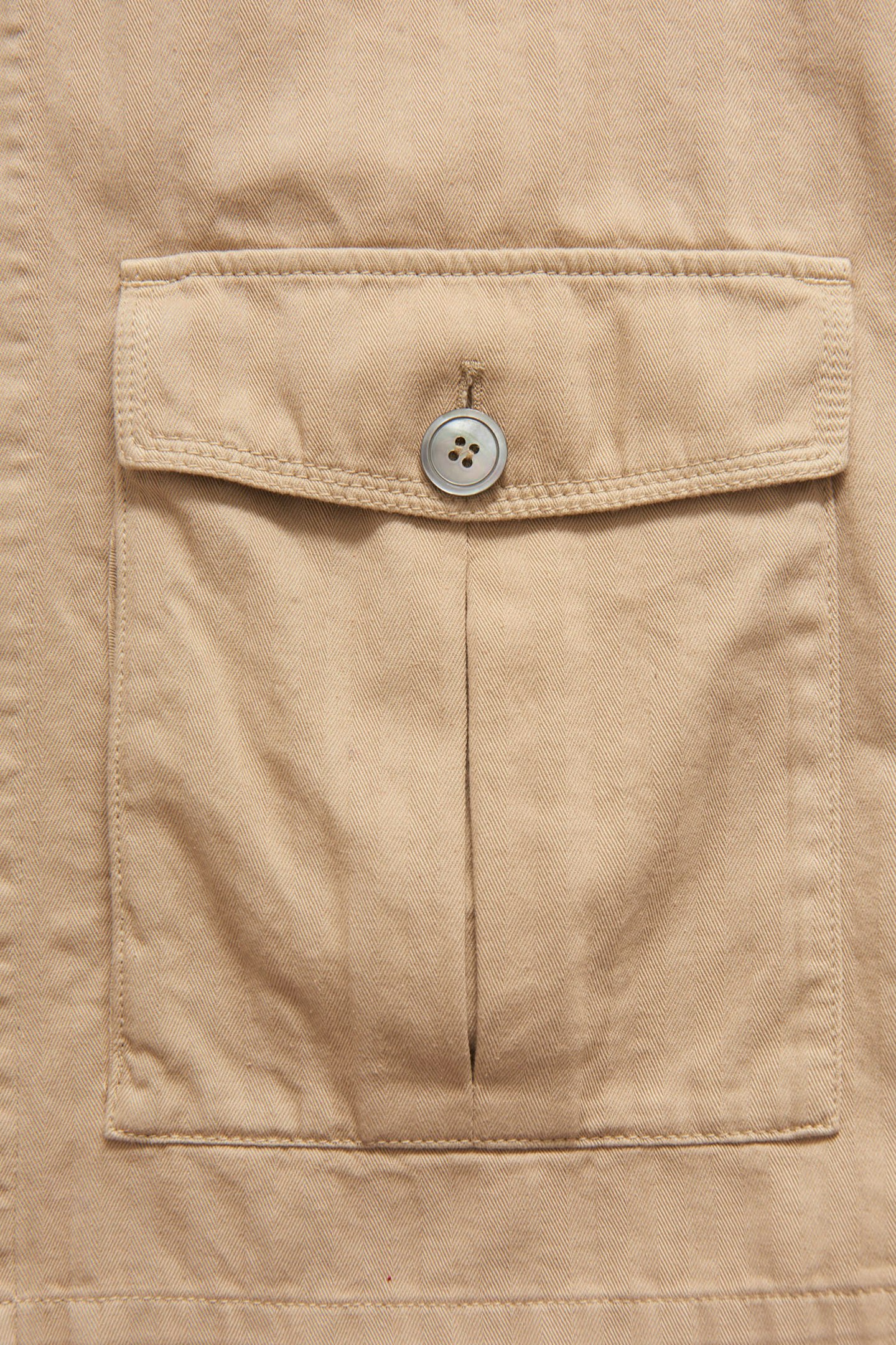 Ufôret skjortejakke i safari-stil med rett passform. Utstyrt med doble utvendige midje- og brystlommer og ekte perlemorsknapper. Stoffet er laget av et robust bomullsmateriale med en diskret fiskebeinsstruktur.