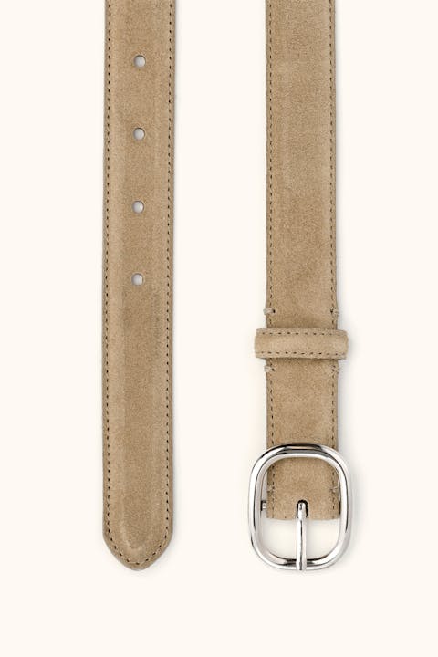 Belte av italiensk finfibret semsket skinn med oval spenne. Beltet er 2,5 cm bredt.