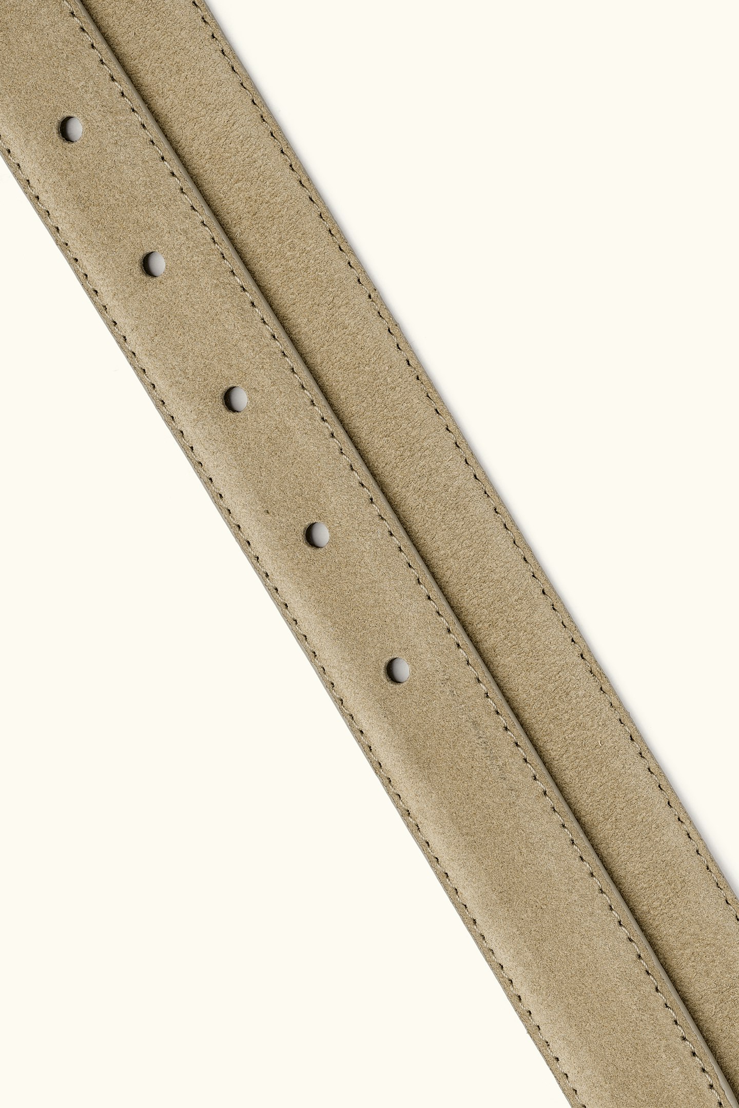 Belte av italiensk finfibret semsket skinn med oval spenne. Beltet er 2,5 cm bredt.