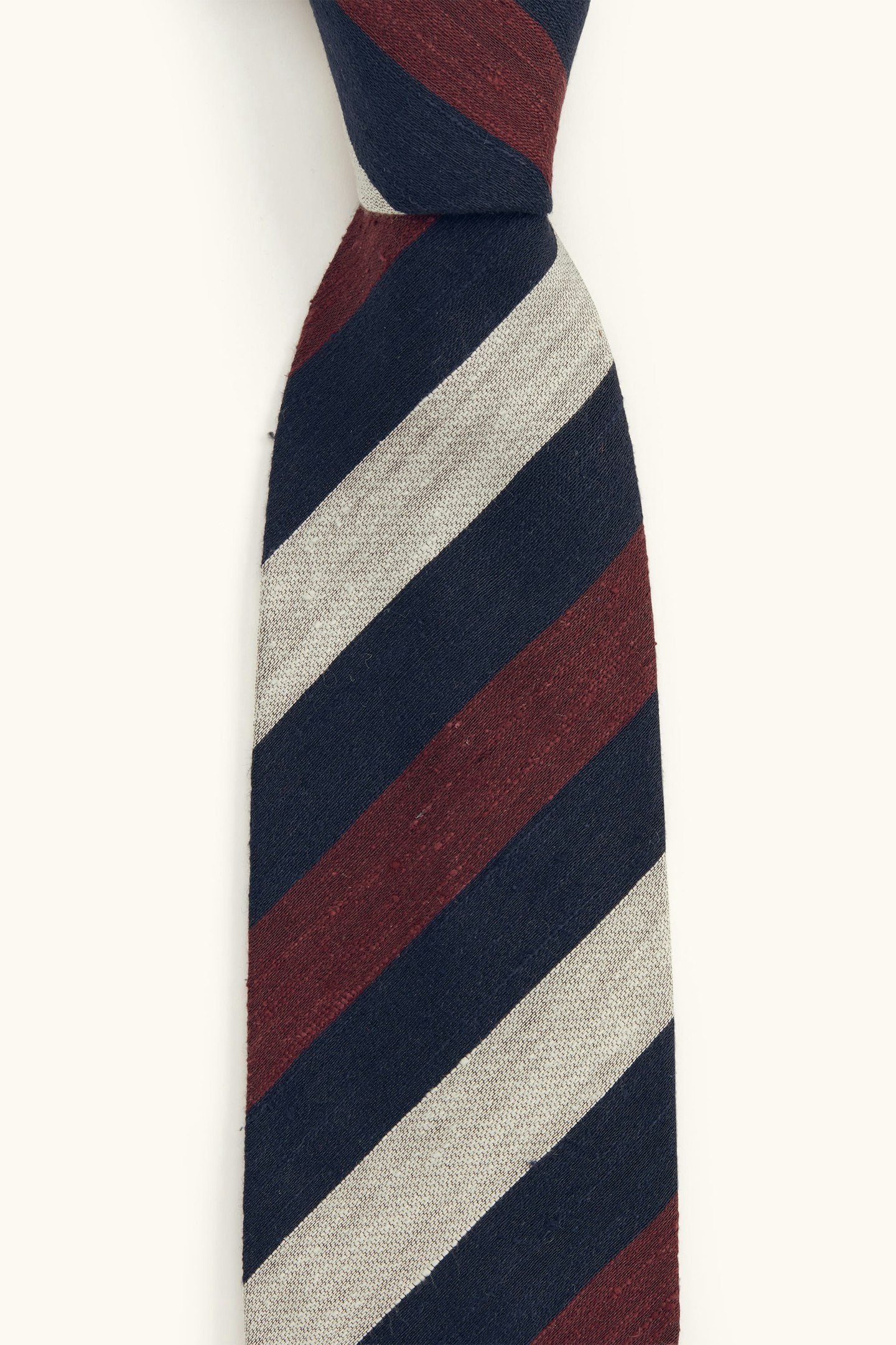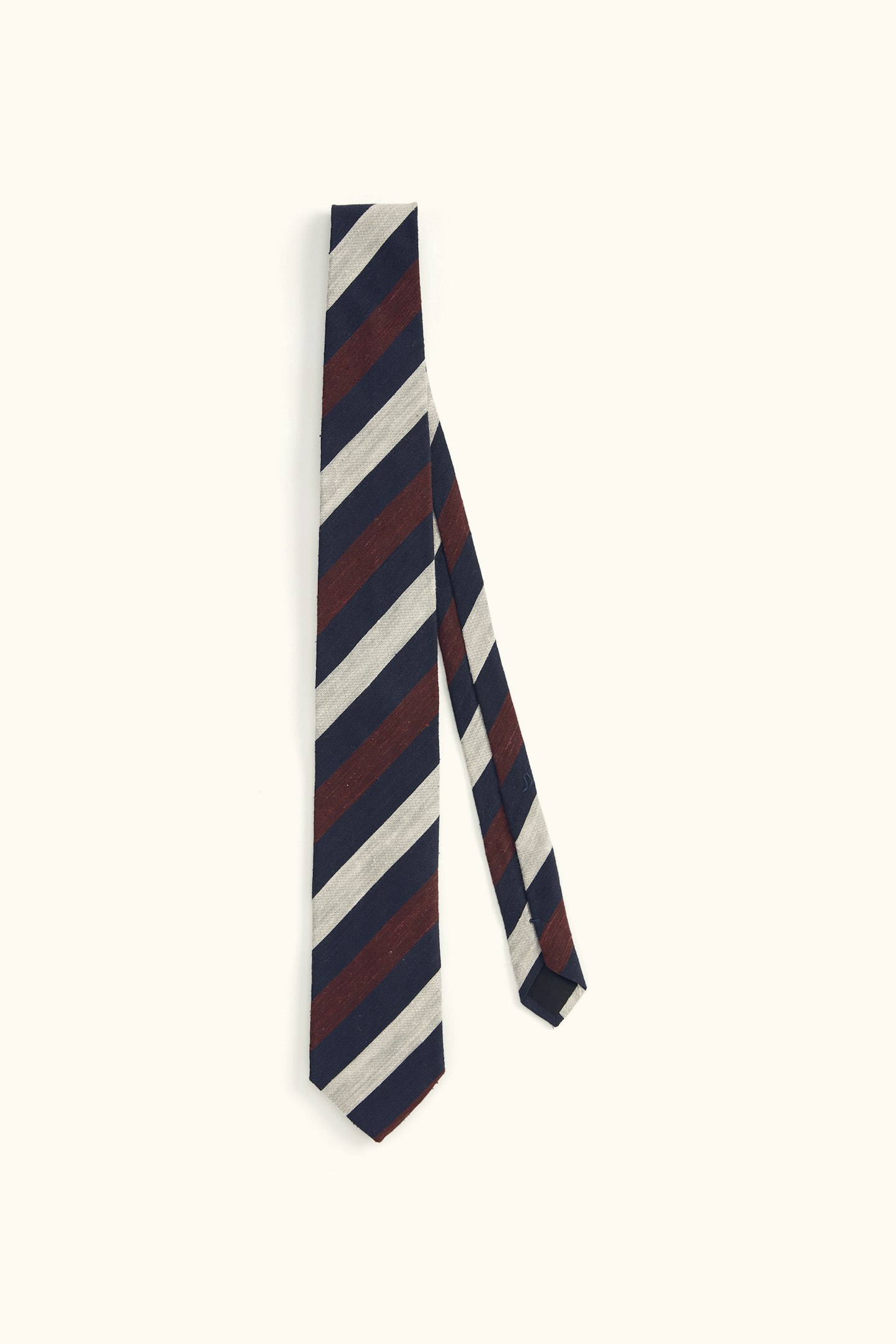 Et stripete slips i 100 % silke, vevd i en shantung-struktur som gir en litt ujevn, men elegant overflate. Den rå teksturen skaper en avslappet, men sofistikert karakter som passer godt til både lin- og ulljakker.