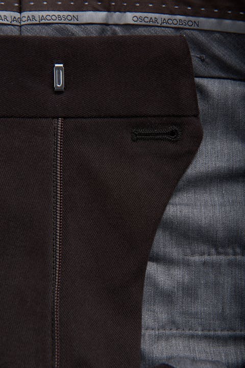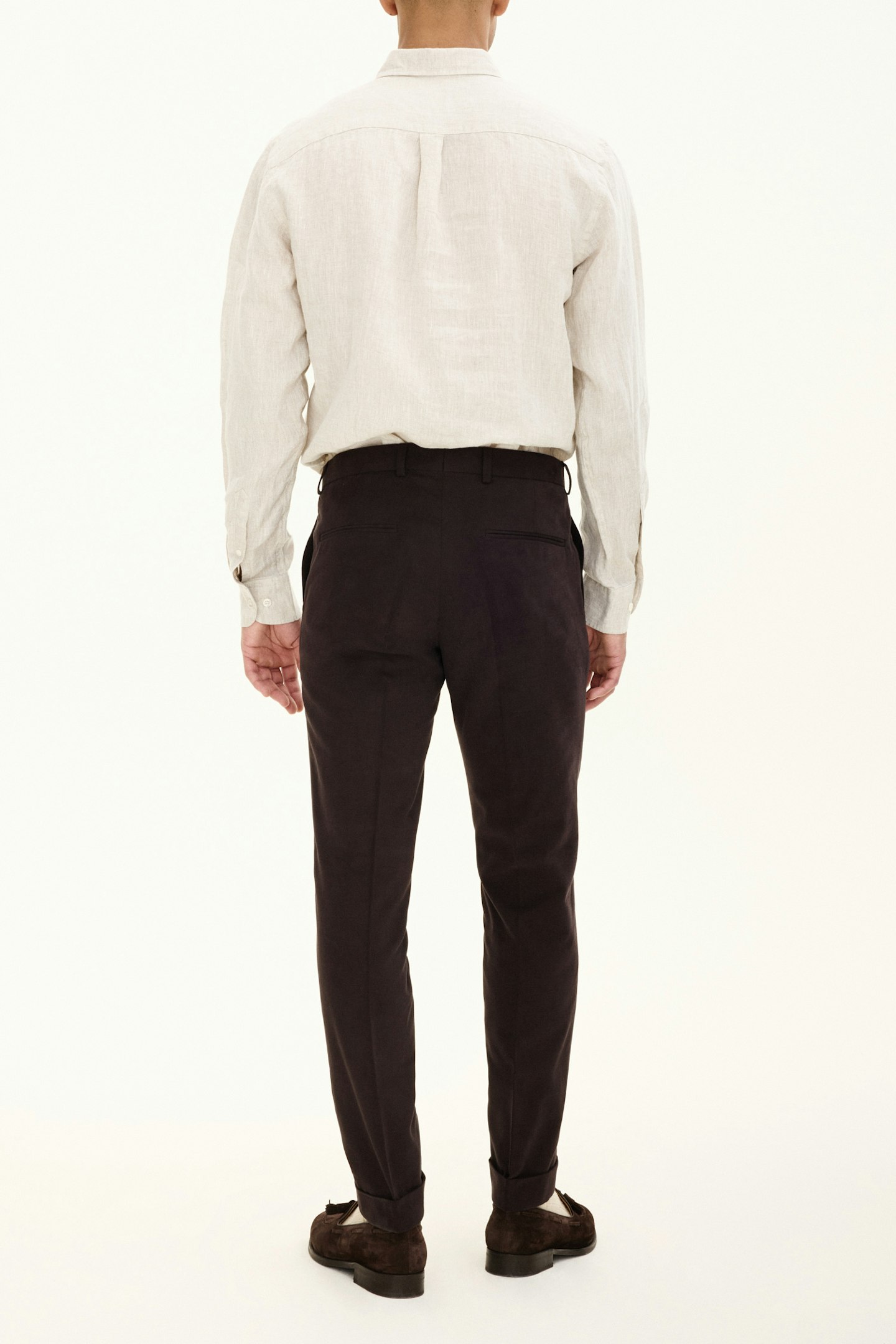 Dressbukser med smal passform, oppbrett og normal høy liv. Semi-formelt materiale i bomullstwill.