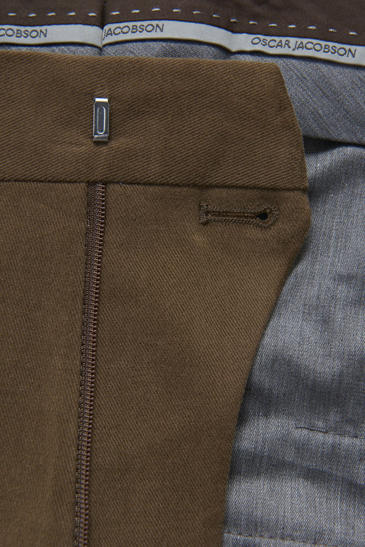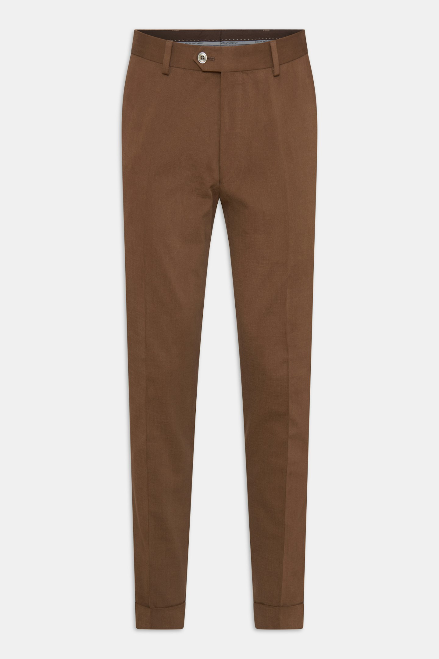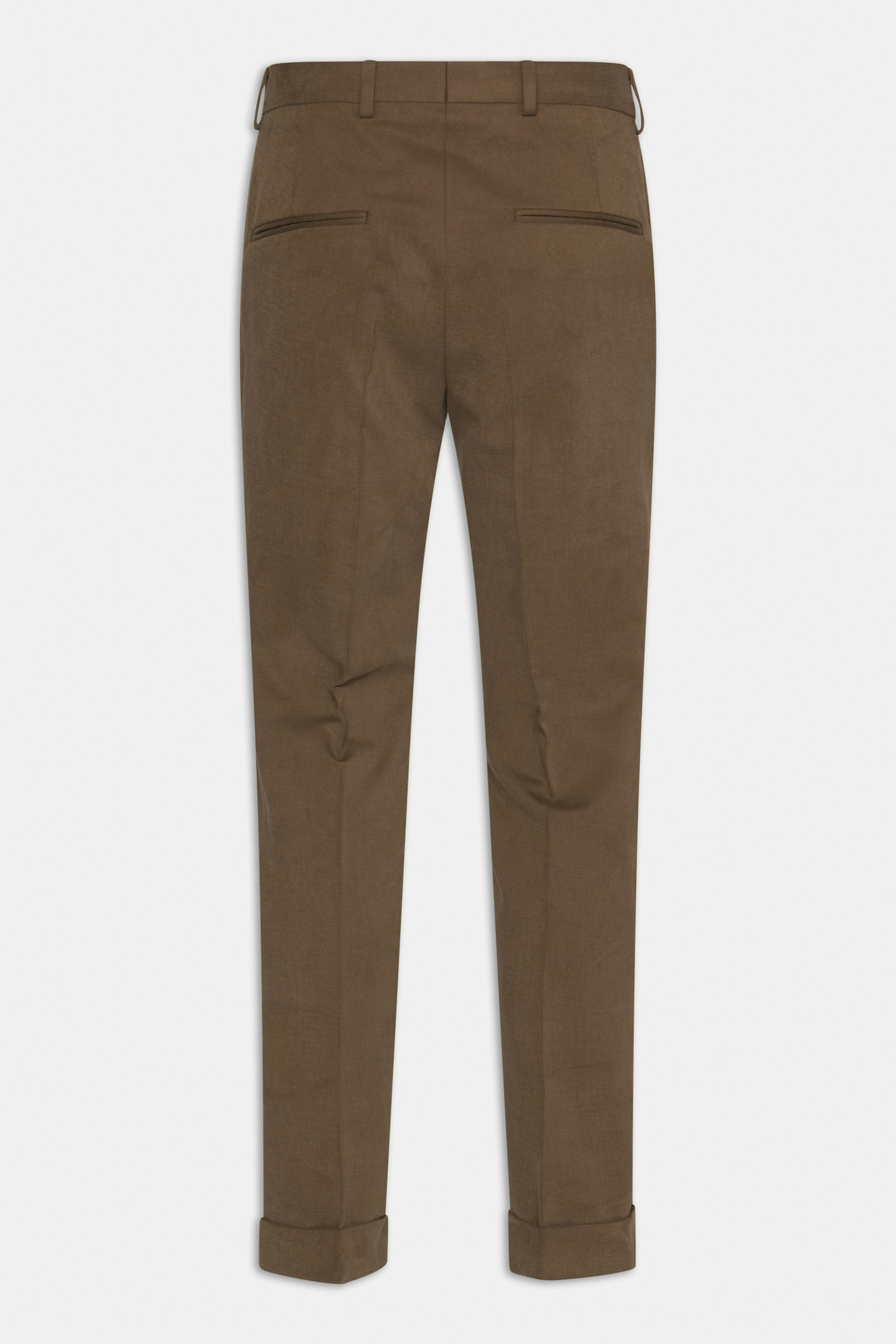 Dressbukser med smal passform, oppbrett og normal høy liv. Semi-formelt materiale i bomullstwill.