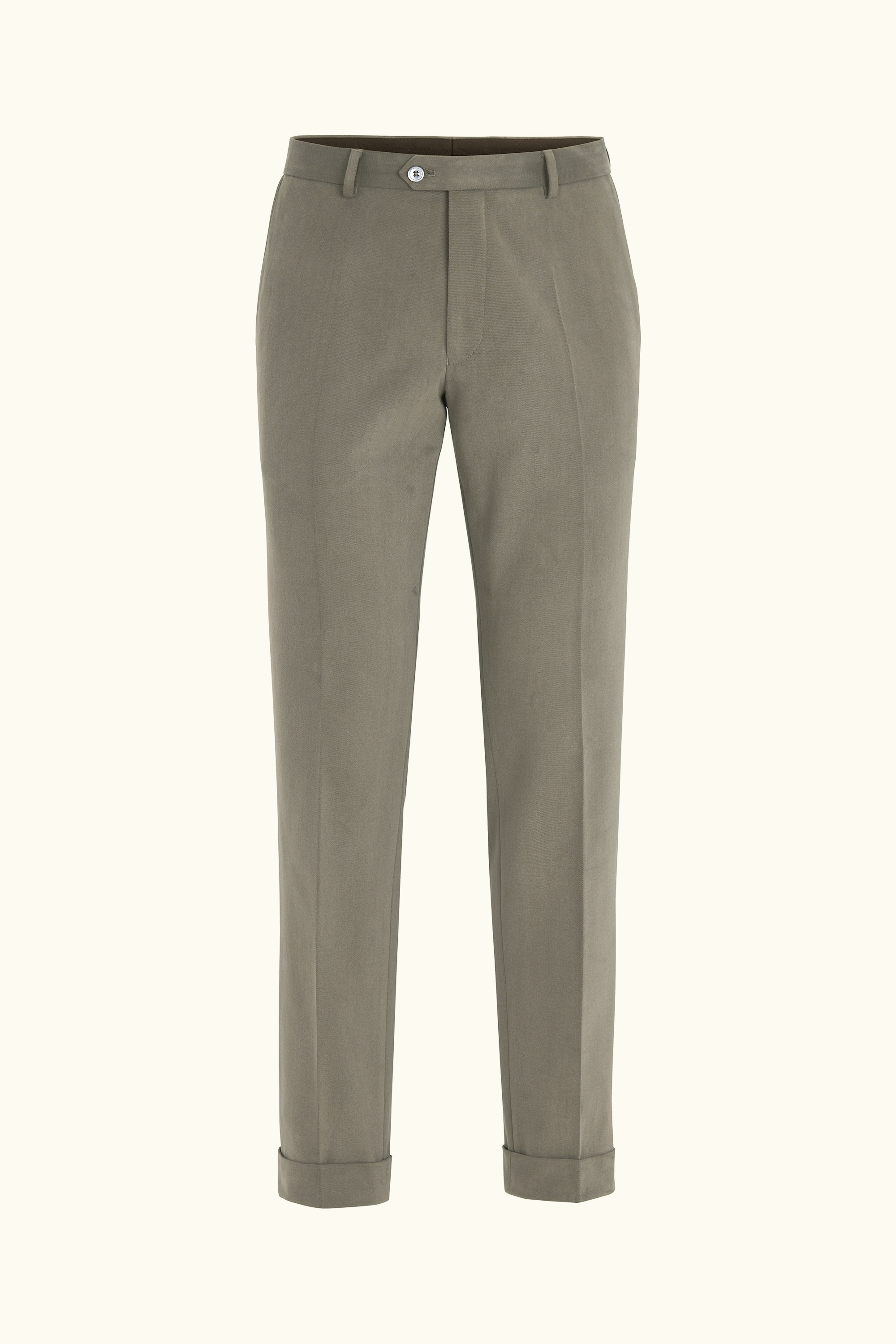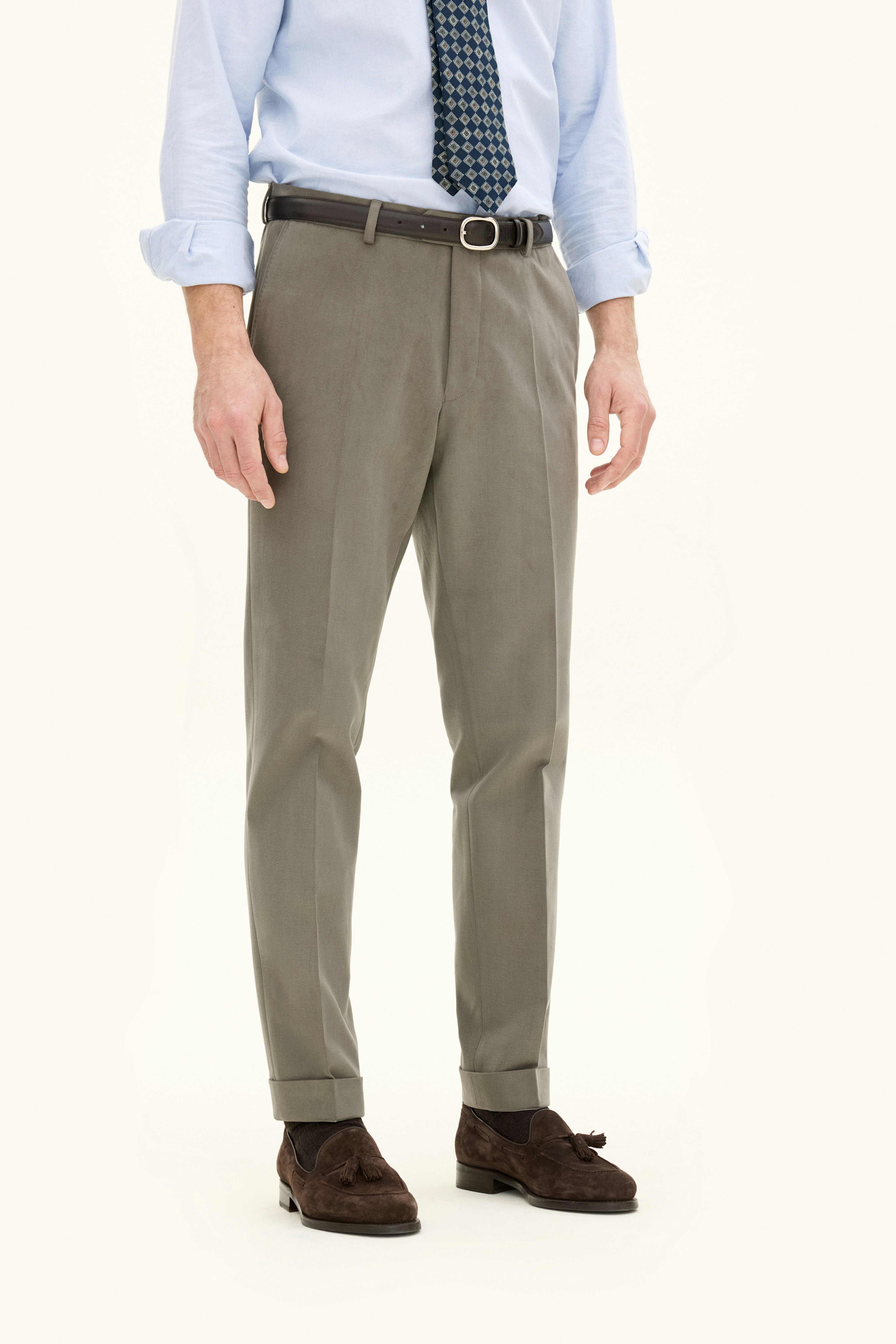 Dressbukser med smal passform, oppbrett og normal høy liv. Semi-formelt materiale i bomullstwill.