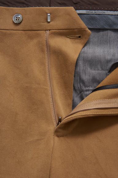 Dressbukser med smal passform, oppbrett og normal høy liv. Semi-formelt materiale i bomullstwill.