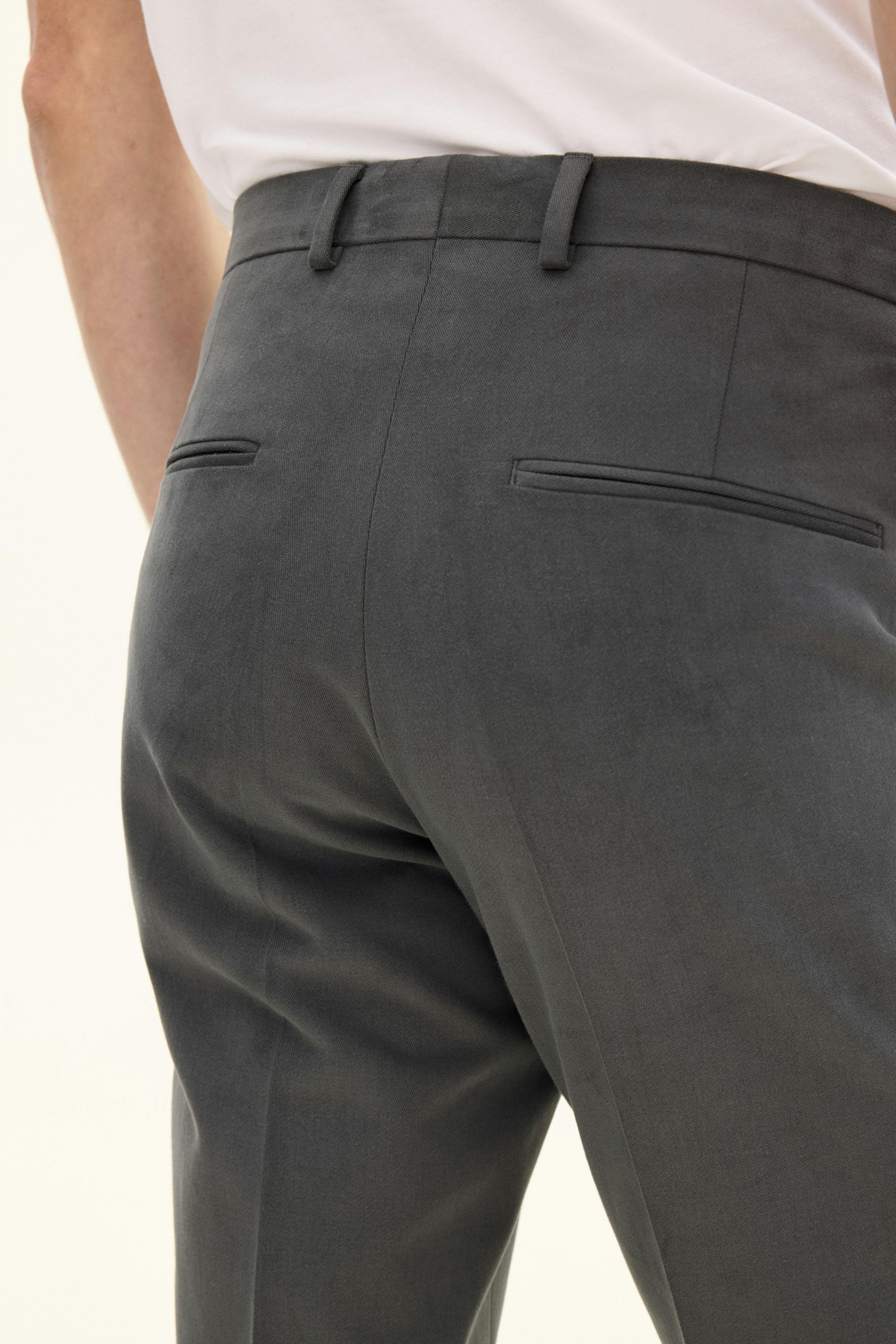 Dressbukser med smal passform, oppbrett og normal høy liv. Semi-formelt materiale i bomullstwill.