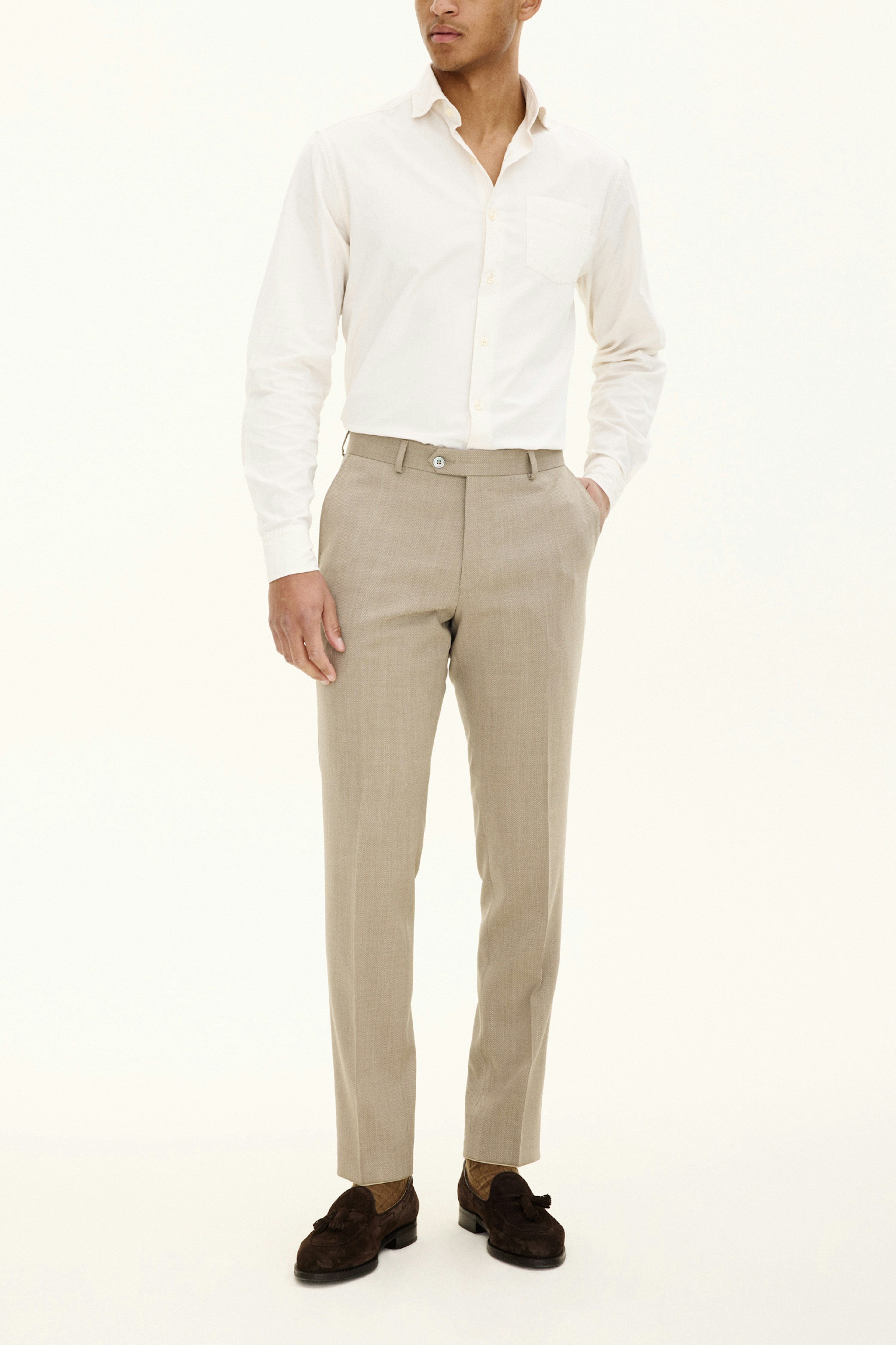 Ullbukse med elegant mikrostruktur. Denne modellen har en smal passform, normal midje og benlengde der buksene ender rett over skoen og har et naturlig fall.