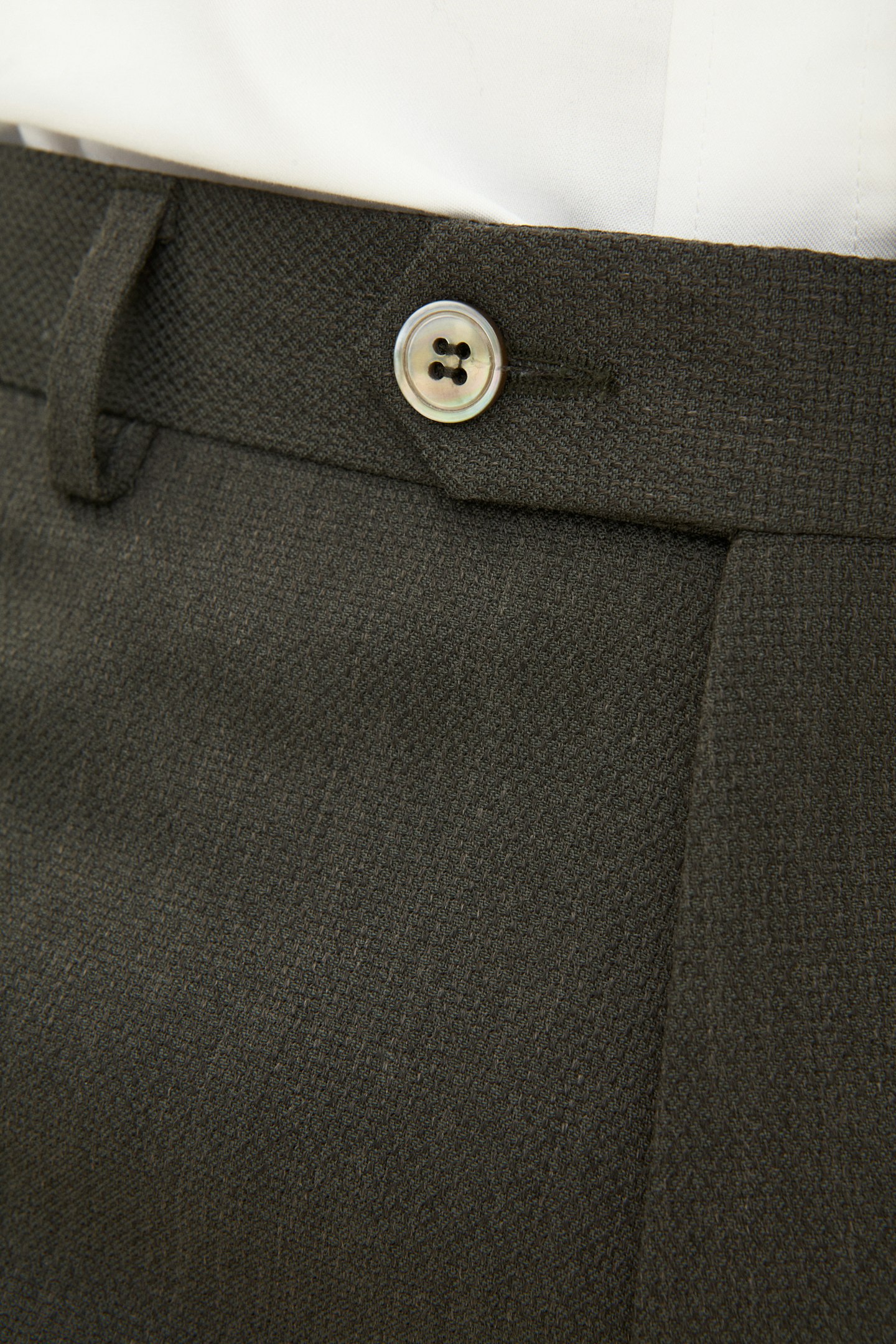 Ullbukse med elegant mikrostruktur. Denne modellen har en smal passform, normal midje og benlengde der buksene ender rett over skoen og har et naturlig fall.