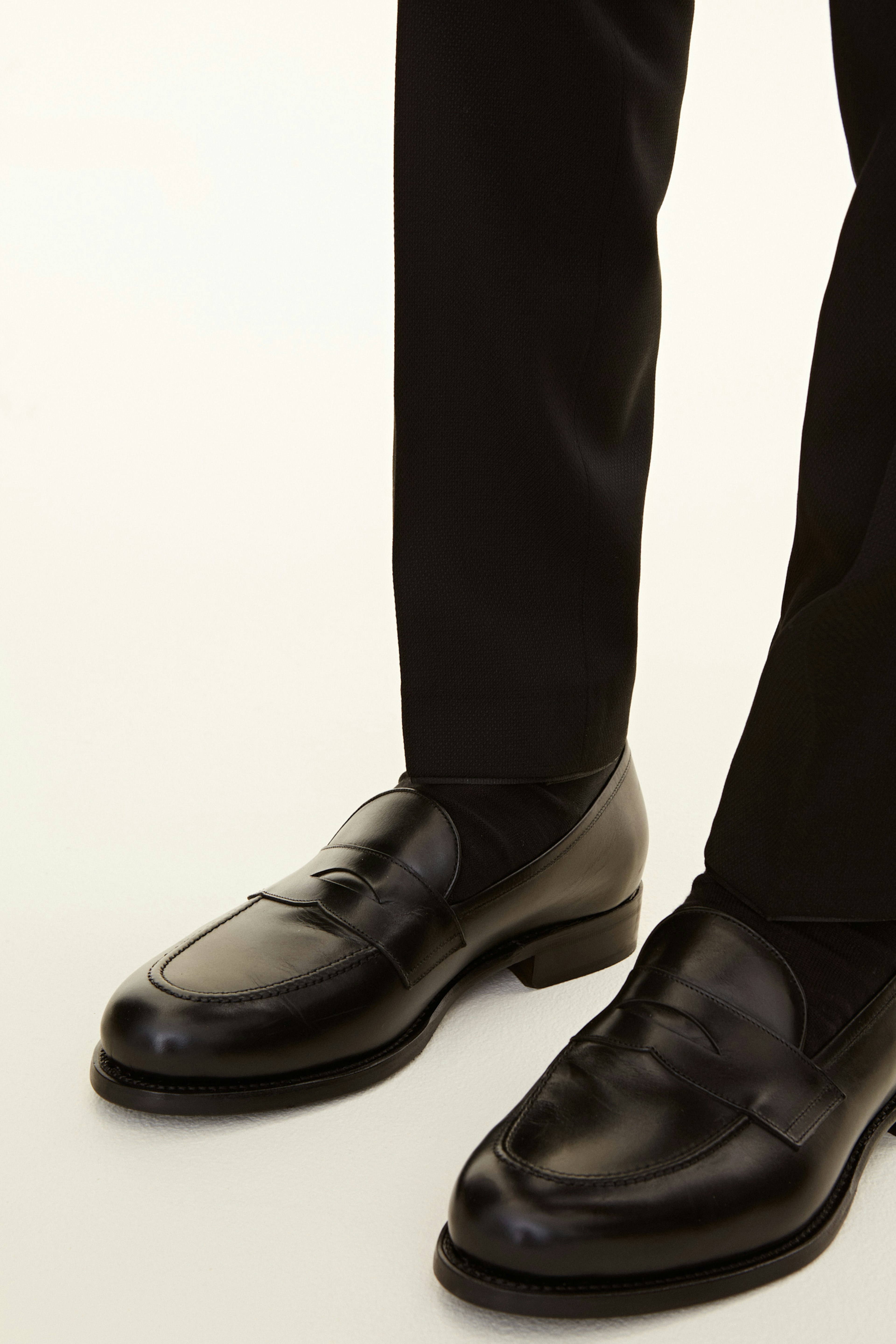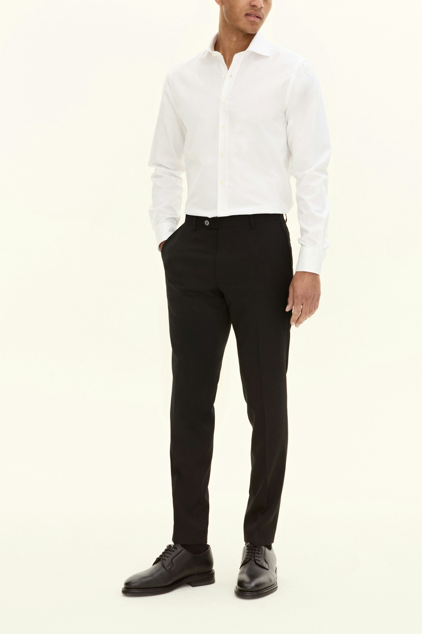 Ullbukse med elegant mikrostruktur. Denne modellen har en smal passform, normal midje og benlengde der buksene ender rett over skoen og har et naturlig fall.