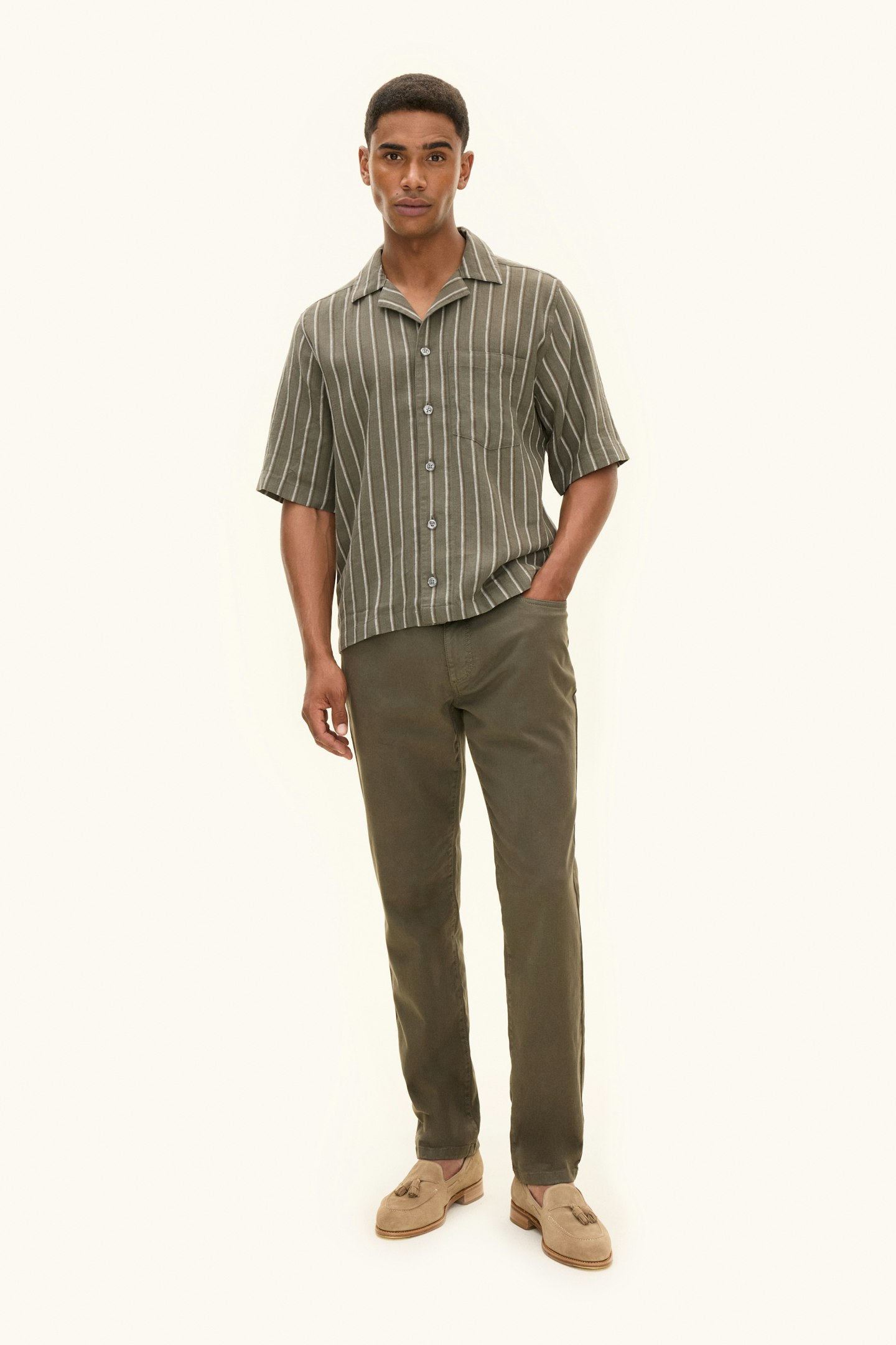 Slim fit skjorte i 100 % lin med et tidløst stripete mønster. Sløyfekragen og den luftige linkvaliteten gjør den til det perfekte valget for varmere dager - avslappet, men likevel velkledd.