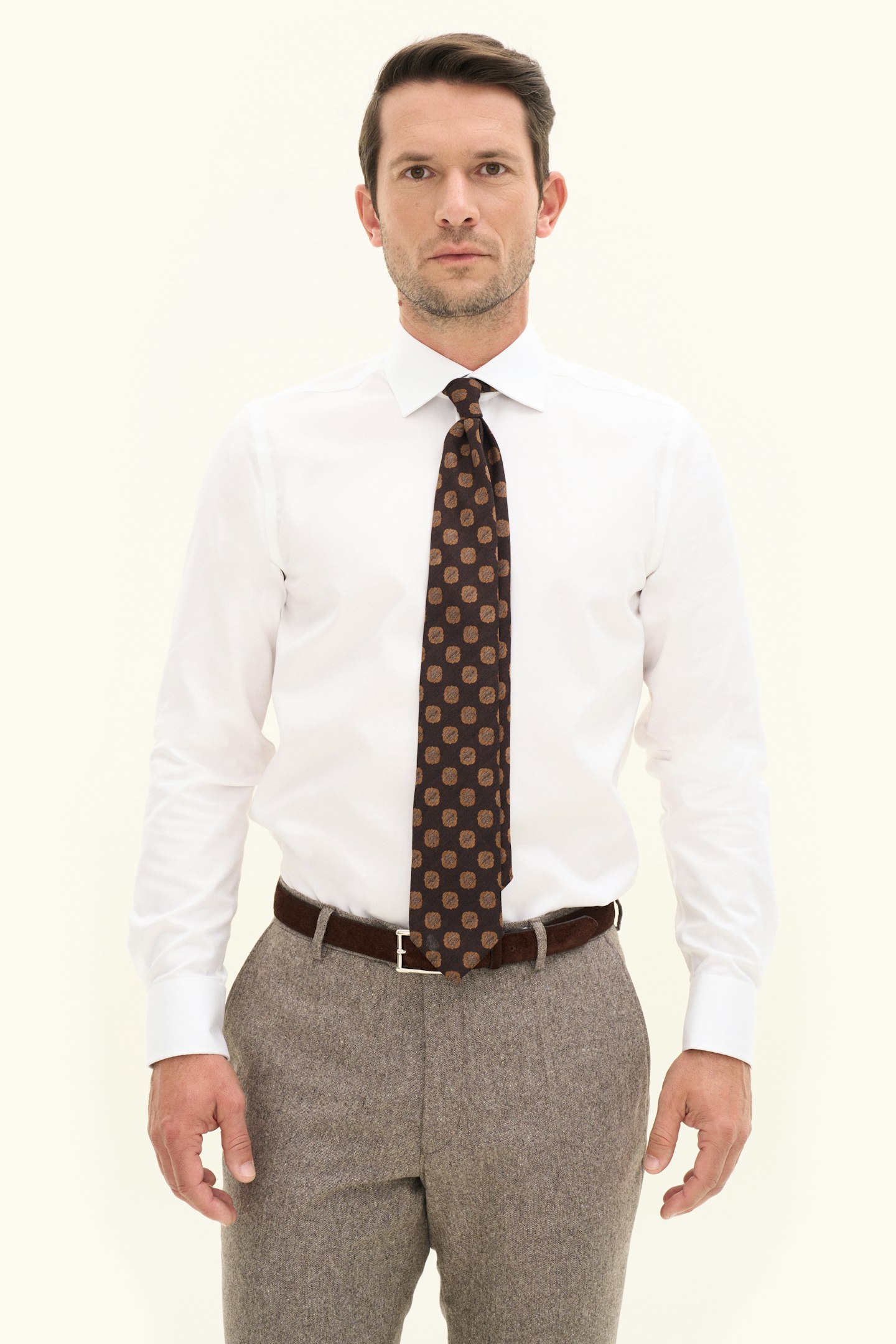 1. BRYSTVIDDE Mål fra armhule til armhule. Multipliser med 2. 2. RYGGBREDDE Mål langs ryggens søm. 3. PLAGGLENGDE RYGG Mål fra midten av nakken til skjortens nederkant 4. ERMLÆNGDE Mål fra erme/skuldersøm til ermeslutt inkl. mansjett KRAGE Mål omkretsen om din egen hals. Skjortens størrelse tilsvarer omkrets i cm. Størrelse 38 har altså 38cm i halsen.